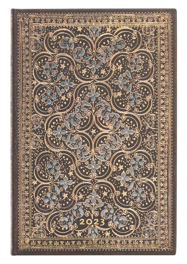 Kalendarz 2023 ekskluzywnej marki Paperblanks. Format mini typu horizontal - cały tydzień rozplanowany jest na 2 stronach. Kalendarium w języku angielskim. W środku miejsce na notatki, roczny planer, oznaczone wybrane święta międzynarodowe, mini kalendarium, międzynarodowe numery telefonów, strefy czasowe, dodatkowe informacje, mini skorowidz na adresy i telefony. Oprawa twarda. Zamkniecie na gumkę. Wymiary 95x140 mm, 160 stron. Kalendarz posiada 2 satynowe wstążki jako zakładki. Na końcu na wewnętrznej stronie okładki jest koperta na drobne notatki czy paragony. Papier ekologiczny, bezkwasowy, gramatura 100. Wzór na okładce został pierwotnie stworzony w 1675 roku do prawy książki The Government of the Tongue Richarda Allestree. Równowaga otwartej przestrzeni i skomplikowanych elementów sprawia, że jest lśniącym klejnotem tamtego okresu.