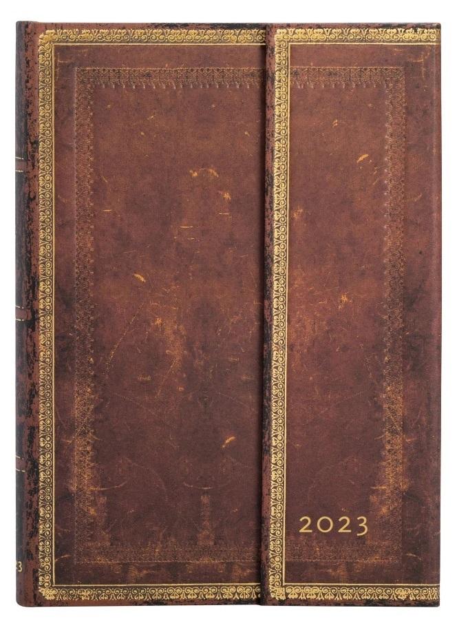 Kalendarz 2023 ekskluzywnej marki Paperblanks. Format midi typu horizontal - cały tydzień rozplanowany jest na 2 stronach. Kalendarium w języku angielskim. W środku miejsce na notatki, roczny planer, oznaczone wybrane święta międzynarodowe, mini kalendarium, międzynarodowe numery telefonów, strefy czasowe, dodatkowe informacje, mini skorowidz na adresy i telefony. Oprawa twarda. Zamkniecie na magnes. Wymiary 130x180 mm (format midi), 160 stron. Kalendarz posiada 2 satynowe wstążki jako zakładki. Na końcu na wewnętrznej stronie okładki jest koperta na drobne notatki czy paragony. Papier ekologiczny, bezkwasowy, gramatura 100. Elegancka okładka inspirowana jest renesansowymi oprawami książek a bogate brązowe tło nawiązujące kolorem do znoszonego siodła dodaje surowości ogólnemu wizerunkowi.