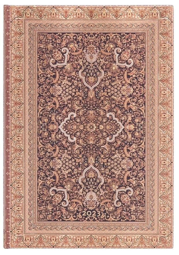 Kalendarz 2023 ekskluzywnej marki Paperblanks. Format midi typu horizontal - cały tydzień rozplanowany jest na 2 stronach. Kalendarium w języku angielskim. W środku miejsce na notatki, roczny planer, oznaczone wybrane święta międzynarodowe, mini kalendarium, międzynarodowe numery telefonów, strefy czasowe, dodatkowe informacje, mini skorowidz na adresy i telefony. Oprawa twarda. Zamkniecie na gumkę. Wymiary 130x180 mm (format midi), 160 stron. Kalendarz posiada 2 satynowe wstążki jako zakładki. Na końcu na wewnętrznej stronie okładki jest koperta na drobne notatki czy paragony. Papier ekologiczny, bezkwasowy, gramatura 100.