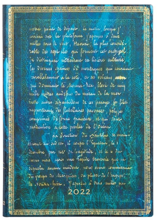Kalendarz 2023 ekskluzywnej marki Paperblanks. Seria flexi - elastyczna oprawa i grzbiet. Format midi typu horizontal - cały tydzień rozplanowany jest na 2 stronach. Kalendarium w języku angielskim. W środku miejsce na notatki, roczny planer, oznaczone wybrane święta międzynarodowe, mini kalendarium, międzynarodowe numery telefonów, strefy czasowe, dodatkowe informacje, mini skorowidz na adresy i telefony. Wymiary 125x175 mm, 176 stron. Kalendarz posiada 2 satynowe wstążki jako zakładki. Na końcu na wewnętrznej stronie okładki jest koperta na drobne notatki czy paragony. Papier ekologiczny, bezkwasowy, gramatura 100. Okładka ozdobiona jest fragmentami rękopisów Juliusza Verne - autora znanego miedzy innymi z książek "Dwadzieścia tysięcy mil podmorskiej żeglugi" i "W osiemdziesiąt dni dookoła świata". Tylna okładka ukazuje kapitana Nemo podziwiającego gigantyczną kałamarnicę.