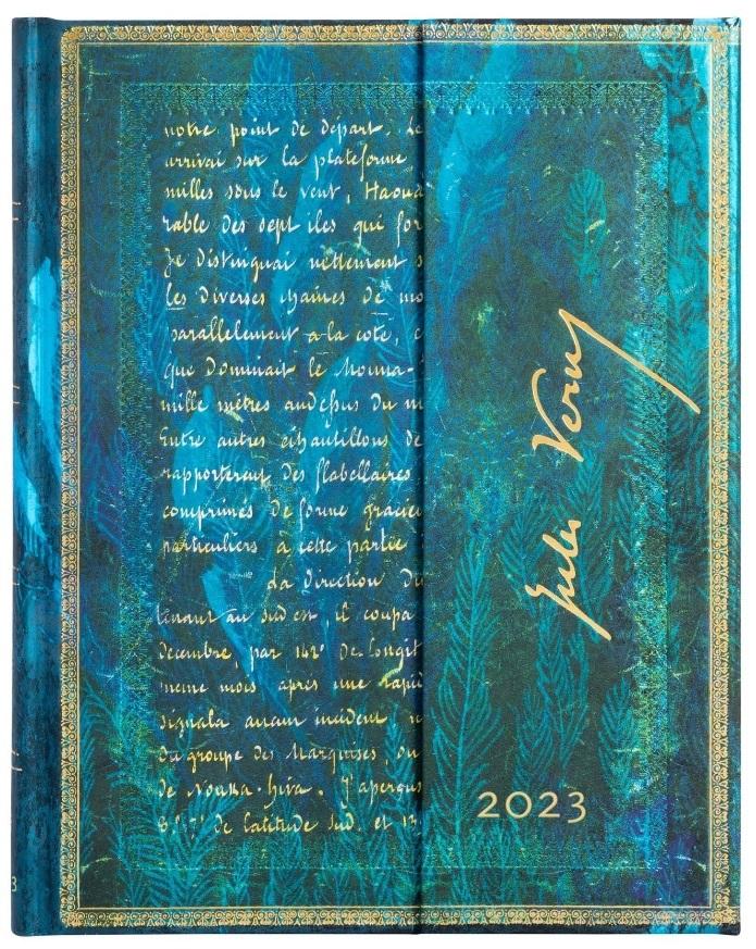 Kalendarz 2023 ekskluzywnej marki Paperblanks. Format ultra typu vertical - cały tydzień rozplanowany jest na 2 stronach z podziałką godzinową. Kalendarium w języku angielskim. W środku miejsce na notatki, roczny planer, oznaczone wybrane święta międzynarodowe, mini kalendarium, międzynarodowe numery telefonów, strefy czasowe, dodatkowe informacje, mini skorowidz na adresy i telefony. Oprawa twarda. Zamkniecie na magnes. Wymiary 180x230 mm (format ultra), 160 stron. Kalendarz posiada 2 satynowe wstążki jako zakładki. Na końcu na wewnętrznej stronie okładki jest koperta na drobne notatki czy paragony. Papier ekologiczny, bezkwasowy, gramatura 100. Okładka ozdobiona jest fragmentami rękopisów Juliusza Verne - autora znanego miedzy innymi z książek "Dwadzieścia tysięcy mil podmorskiej żeglugi" i "W osiemdziesiąt dni dookoła świata". Tylna okładka ukazuje kapitana Nemo podziwiającego gigantyczną kałamarnicę.