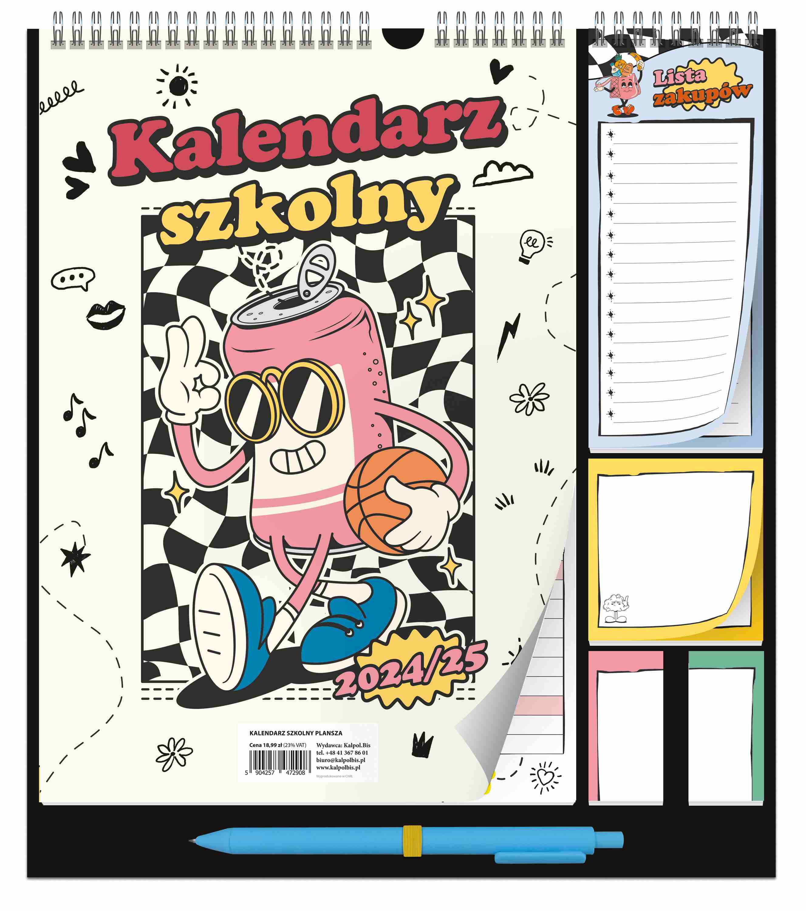"układ kalendarium miesięczny, kalendarium od września do sierpnia, kalendarium z podziałem na członków rodziny, wielkość kalendarium: 215x310 mm, 12 kart 4+0 (zadruk jednostronny), 120 gsm, dodatkowo: karteczki z listą zakupów, karteczki samoprzylepne 30 szt., znaczniki samoprzylepne x2 30 szt., całość na plaszy ze spiralą + zawieszką." Brak recenzjix