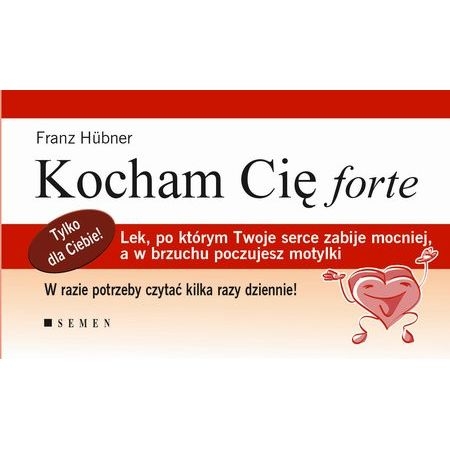 Lek, po którym Twoje serce zabije mocniej,a w brzuchu poczujesz motylki.Jedna z czterech książeczek tworzących serię, która zyskała ogromną sympatię Czytelników, zarówno dzięki zawartym treściom, jak i wyglądu, imitującego opakowanie lekarstwa. Mimo iż są to niewielkie, kolorowe książeczki, lecz za to pełne życiowych mądrości! ,,Kocham Cię forte""? Tak! To kolejny, niezwykły ,,lek"" - bez możliwości przedawkowania i działań ubocznych. ZastosowanieSzeroką gamę możliwości ,,Kocham Cię forte"" można testować w ciągu trzydziestu sześciu dni lub w zależności od potrzeby stosować środek w pojedynczych dawkach. Przeciwwskazania Nie stosować ,,Kocham Cię forte"" w razie stwierdzonej niechęci wobec zakochanych par i uczucia miłości.