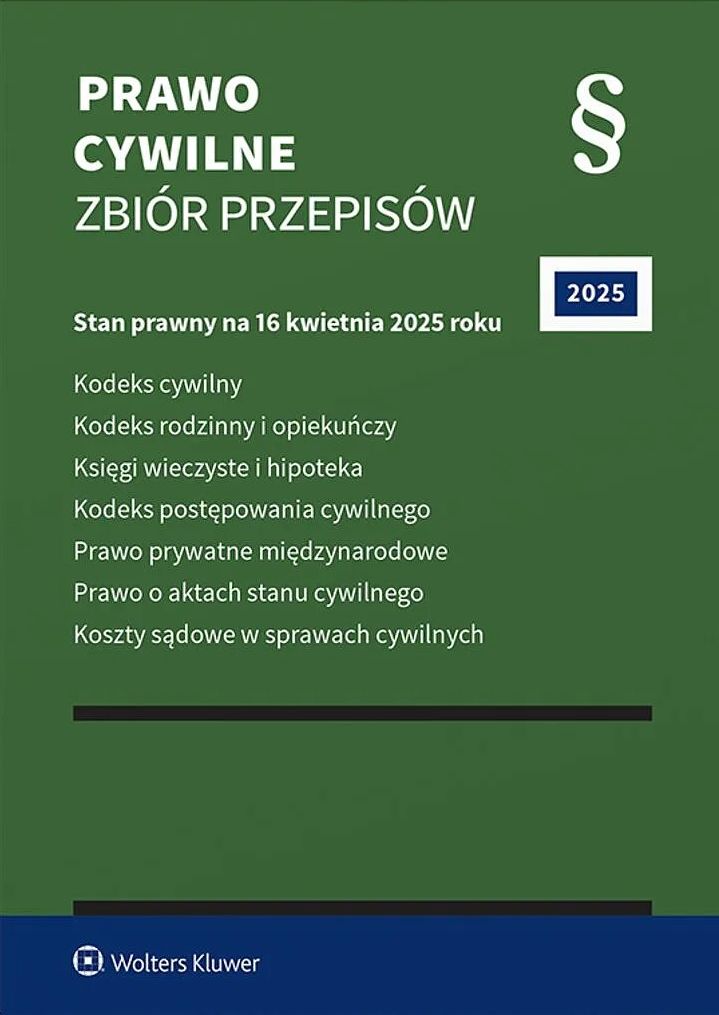UWZGLĘDNIA ZMIANY WCHODZĄCE W ŻYCIE Z DNIEM: KODEKS CYWILNY: 29 sierpnia 2024 r. - ustawa z 24 lipca 2024 r. o zmianie ustawy o dochodzeniu roszczeń w postępowaniu grupowym oraz niektórych innych ustaw (Dz.U. poz. 1237) KSIĘGI WIECZYSTE I HIPOTEKA: 10 listopada 2024 r. - ustawa z 12 lipca 2024 r. - Przepisy wprowadzające ustawę - Prawo komunikacji elektronicznej (Dz.U. poz. 1222) 18 marca 2025 r. - obwieszczenie Marszałka Sejmu Rzeczypospolitej Polskiej z 6 marca 2025 r. w sprawie ogłoszenia jednolitego tekstu ustawy o księgach wieczystych i hipotece (Dz.U. poz. 341) KODEKS POSTĘPOWANIA CYWILNEGO: 29 sierpnia 2024 r. - ustawa z 24 lipca 2024 r. o zmianie ustawy o dochodzeniu roszczeń w postępowaniu grupowym oraz niektórych innych ustaw (Dz.U. poz. 1237) 1 października 2024 r. - ustawa z 15 maja 2024 r. o wspieraniu rodziców w aktywności zawodowej oraz w wychowaniu dziecka - "Aktywny rodzic" (Dz.U. poz. 858) 23 października 2024 r. - obwieszczenie Marszałka Sejmu Rzeczypospolitej Polskiej z 10 października 2024 r. w sprawie ogłoszenia jednolitego tekstu ustawy - Kodeks postępowania cywilnego (Dz.U. poz. 1568) 1 listopada 2024 r. - ustawa z 9 maja 2024 r. o zmianie ustawy o systemie ubezpieczeń społecznych oraz niektórych innych ustaw (Dz.U. poz. 863) 10 listopada 2024 r. - ustawa z 12 lipca 2024 r. - Przepisy wprowadzające ustawę - Prawo komunikacji elektronicznej (Dz.U. poz. 1222) 1 stycznia 2025 r. - ustawa z 18 listopada 2020 r. o doręczeniach elektronicznych (Dz.U. z 2023 r. poz. 285 ze zm.) 1 czerwca 2025 r. - ustawa z 20 marca 2025 r. o rynku pracy i służbach zatrudnienia (Dz.U. poz. 620) 18 kwietnia 2026 r. - ustawa z 5 sierpnia 2015 r. o zmianie ustawy o ochronie konkurencji i konsumentów oraz niektórych innych ustaw (Dz.U. poz. 1634) PRAWO O AKTACH STANU CYWILNEGO: 15 sierpnia 2024 r. - ustawa z 28 lipca 2023 r. o zmianie ustawy - Kodeks cywilny oraz niektórych innych ustaw (Dz.U. poz. 1615) 6 maja 2025 r. - obwieszczenie Marszałka Sejmu Rzeczypospolitej Polskiej z 24 marca 2025 r. w sprawie ogłoszenia jednolitego tekstu ustawy - Prawo o aktach stanu cywilnego (Dz.U. poz. 594) KOSZTY SĄDOWE W SPRAWACH CYWILNYCH: 29 sierpnia 2024 r. - ustawa z 24 lipca 2024 r. o zmianie ustawy o dochodzeniu roszczeń w postępowaniu grupowym oraz niektórych innych ustaw (Dz.U. poz. 1237) ORAZ: 13 marca 2024 r. - obwieszczenie Ministra Sprawiedliwości z 11 października 2024 r. w sprawie ogłoszenia jednolitego tekstu rozporządzenia Ministra Sprawiedliwości w sprawie maksymalnych stawek taksy notarialnej (Dz.U. poz. 1566) 19 grudnia 2024 r. - rozporządzenie Ministra Sprawiedliwości z 11 grudnia 2024 r. zmieniające rozporządzenie w sprawie określenia stawek wynagrodzenia biegłych, taryf zryczałtowanych oraz sposobu dokumentowania wydatków niezbędnych dla wydania opinii w postępowaniu cywilnym (Dz.U. poz. 1875) 31 grudnia 2024 r. - rozporządzenie Ministra Sprawiedliwości z 23 grudnia 2024 r. zmieniające rozporządzenie w sprawie opłat za czynności radców prawnych (Dz.U. poz. 1947) 31 grudnia 2024 r. - rozporządzenie Ministra Sprawiedliwości z 23 grudnia 2024 r. zmieniające rozporządzenie w sprawie ponoszenia przez Skarb Państwa albo jednostki samorządu terytorialnego kosztów pomocy prawnej udzielonej przez radcę prawnego z urzędu (Dz.U. poz. 1948) 31 grudnia 2024 r. - rozporządzenie Ministra Sprawiedliwości z 23 grudnia 2024 r. zmieniające rozporządzenie w sprawie opłat za czynności adwokackie (Dz.U. poz. 1949) 31 grudnia 2024 r. - rozporządzenie Ministra Sprawiedliwości z 23 grudnia 2024 r. zmieniające rozporządzenie w sprawie ponoszenia przez Skarb Państwa albo jednostki samorządu terytorialnego kosztów nieopłaconej pomocy prawnej udzielonej przez adwokata z urzędu (Dz.U. poz. 1950) 13 marca 2025 r. - obwieszczenie Ministra Sprawiedliwości z 6 marca 2025 r. w sprawie ogłoszenia jednolitego tekstu rozporządzenia Ministra Sprawiedliwości w sprawie wynagrodzenia za czynności tłumacza przysięgłego (Dz.U. poz. 312) 18 m Brak recenzjix
