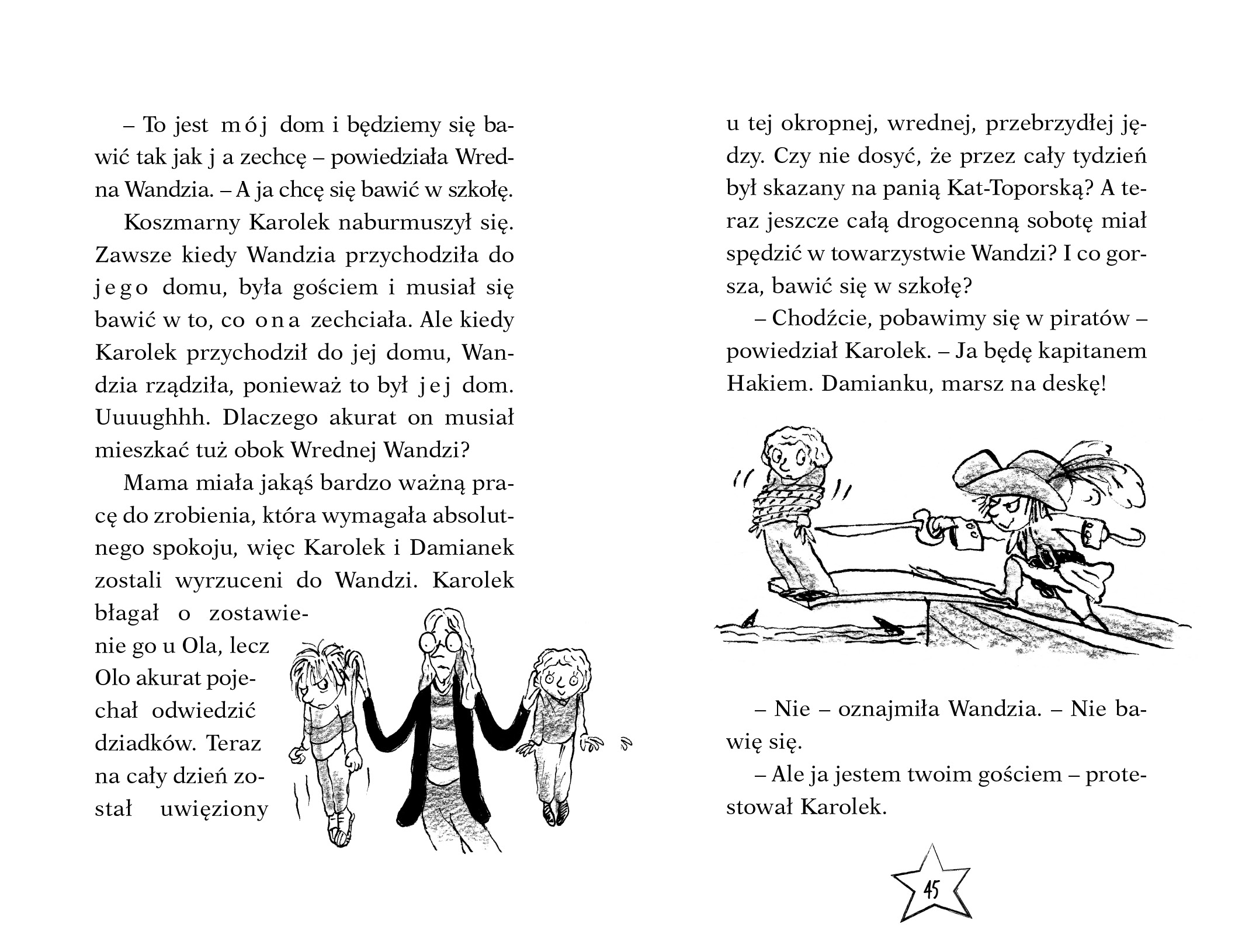 Cześć! Jestem Karolek i wszyscy pytają: dlaczego jesteś ko-szmar-ny, Karolku?! Doskonale wydaję pieniądze, ale fatalnie idzie mi ich zdobywanie. To okropnie niesprawiedliwe! Mam genialny plan, jak stać się obrzydliwie bogatym: szykuję prawdziwy napad na bank i skarb piratów. Tylko Wredna Wandzia jak zwykle chce mi pokrzyżować plany. Miarka się przebrała i Kapitalny Karol zaraz zrobi porządek z tą przebrzydłą jędzą. Żegnaj, kwaśna mino! A jak to nie pomoże, to wydam własną gazetę "Gorący grom": skandale, szkolne plotki, sensacje. Każdy zapłaci za te bulwersujące sekrety! Kolekcja arcydożartych żartów i niecnych podstępów, które każde dziecko chciałoby zrobić, ale wystarczy, jak o nich poczyta lub ich posłucha. Najbardziej koszmarny bohater literatury dziecięcej powraca! Seria o "Koszmarnym Karolku" bawi od prawie 30 lat, a jego postać i arcydożarte żarty są wciąż aktualne dla kolejnego pokolenia czytelników. Szalony humor, niegrzeczny bohater, krótkie, łatwe w lekturze opowiadania - to jest to, co dzieci (i dorośli też) lubią najbardziej. Brak recenzjix