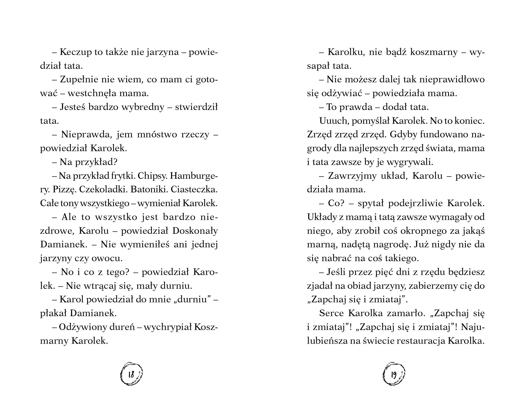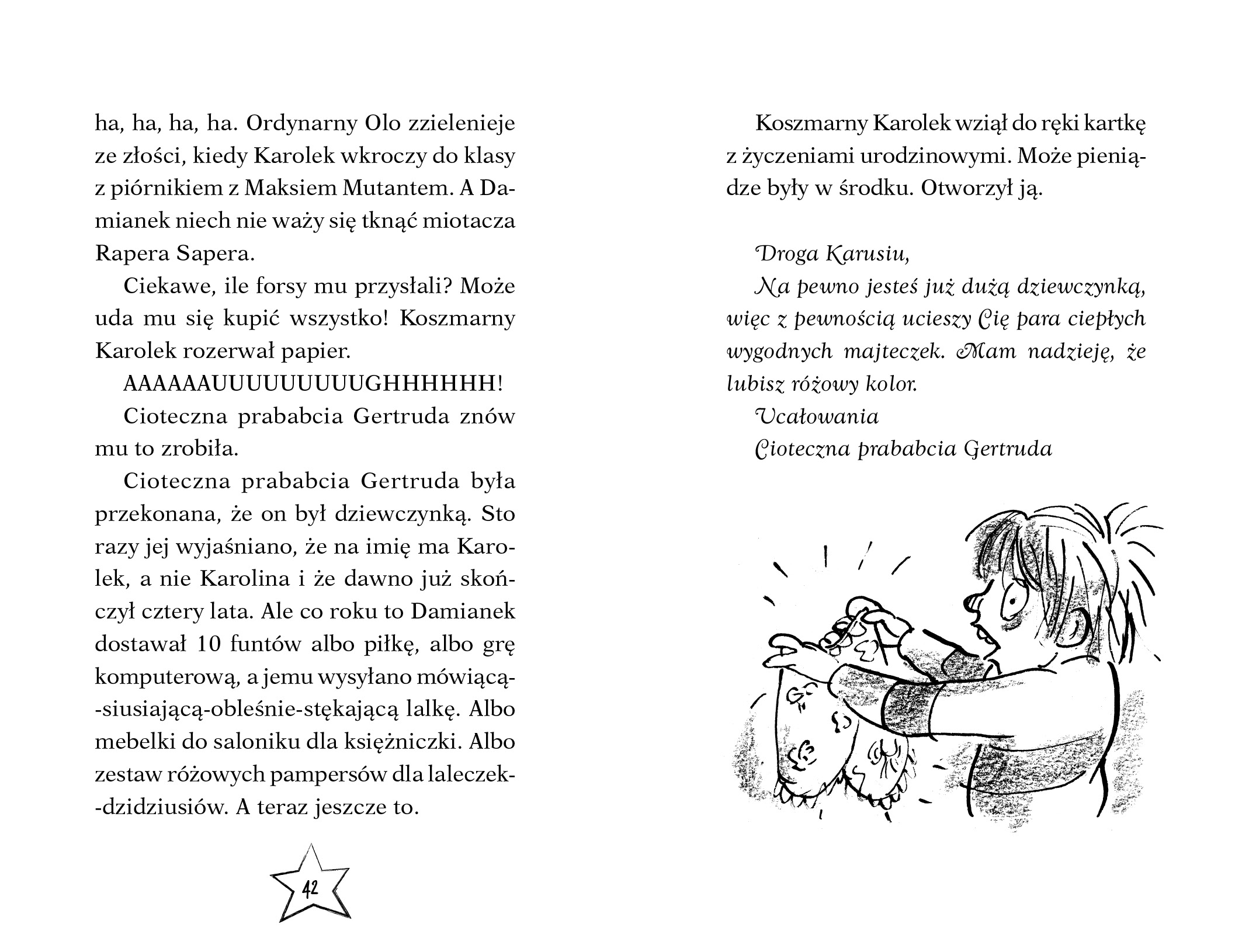 Cześć! Jestem Karolek i wszyscy mówią, że jestem ko-szmar-ny! Horror nad horrory! Moja cioteczna prababcia Gertruda wciąż zapomina, że jestem chłopakiem, a nie jakąś słodką Karusią. I... właśnie wysłała mi w prezencie różowe majteczki. To jakiś senny koszmar! Ale przecież musi być sposób, żeby pozbyć się tych wstrętnych gaci. Jakby tego było mało, to moi zrzędliwi rodzice uparli się, żebym codziennie jadł talerz pełen wstrętnej zieleniny. Tfu! Z tony warzyw to Karolek najbardziej lubi frytki w morzu keczupu! Kolekcja arcydożartych żartów i niecnych podstępów, które każde dziecko chciałoby zrobić, ale wystarczy, jak o nich poczyta lub ich posłucha. Najbardziej koszmarny bohater literatury dziecięcej powraca! Seria o ,,Koszmarnym Karolku"" bawi od prawie 30 lat, a jego postać i arcydożarte żarty są wciąż aktualne dla kolejnego pokolenia czytelników. Szalony humor, niegrzeczny bohater, krótkie, łatwe w lekturze opowiadania - to jest to, co dzieci (i dorośli też) lubią najbardziej. Brak recenzjix