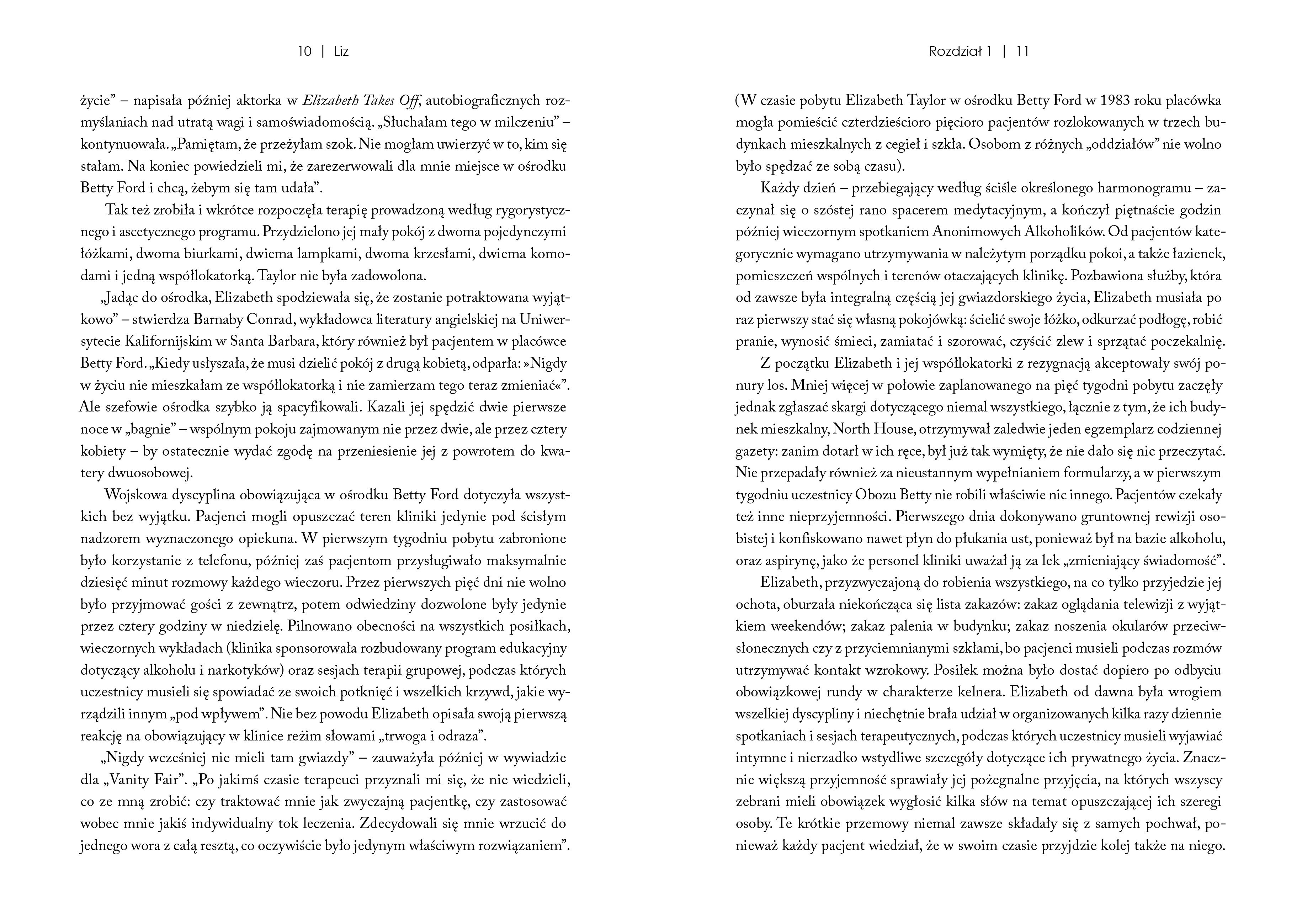 Przez całe swoje życie Elizabeth Taylor w olśniewający i ekstrawagancki sposób grała jedną wybitną rolę: siebie, ostatnią wielką gwiazdę Hollywood. "Ona ma wszystko: czar, pieniądze, piękno, inteligencję. Dlaczego nie umie być szczęśliwa?" Andy Warhol Jedna z najczęściej fotografowanych kobiet świata, ikona stylu i obiekt niezliczonych plotek. Jej życie było dużo bardziej dramatyczne od ekranowych ról. Opresyjna matka była gotowa zrobić z niej gwiazdę za wszelką cenę - Taylor miała jedenaście lat, gdy podbiła świat rolą w Lassie, wróć! Ślub z dziedzicem hotelowej fortuny Hiltonów wzięła jako osiemnastolatka. Rok później była już po pierwszym rozwodzie. "Kiedy kogoś kocham, to kocham na sto procent". Za mąż wychodziła osiem razy - w tym dwukrotnie za Richarda Burtona, miłość swojego życia. Miała tyle romansów, że nawet Watykan oficjalnie potępił jej rozwiązłość. Ale widzowie kochali spojrzenie jej fiołkowych oczu, a Amerykańska Akademia Filmowa dwukrotnie nagrodziła ją Oscarem. "Królowa Anglii czekała na mnie dwadzieścia minut, księżniczka Małgorzata trzydzieści, a prezydent Tito godzinę. Więc chyba mogą, do cholery, chwilę na mnie poczekać na jakimś bezsensownym przyjęciu?" Jej zachowanie mogło doprowadzić do bankructwa wytwórnię filmową. Była właścicielką jednego z najwspanialszych brylantów na świecie. Uwielbiała wystawne życie, ale nigdy nie miała nad nim prawdziwej kontroli. "Nazywam się Elizabeth Taylor. Jestem uzależniona od alkoholu i narkotyków". Znalazła odwagę, aby stawić czoła swoim demonom i w blasku fleszy pojechać na odwyk. Jako jedna z pierwszych bez wahania ruszyła do zbierania pieniędzy na walkę z AIDS w czasach, gdy wszyscy inni woleli zamieść temat pod dywan. Fascynująca opowieść o najbardziej prywatnych momentach z pełnego romansów, skandali i sprzeczności życia Elizabeth Taylor. Brak recenzjix