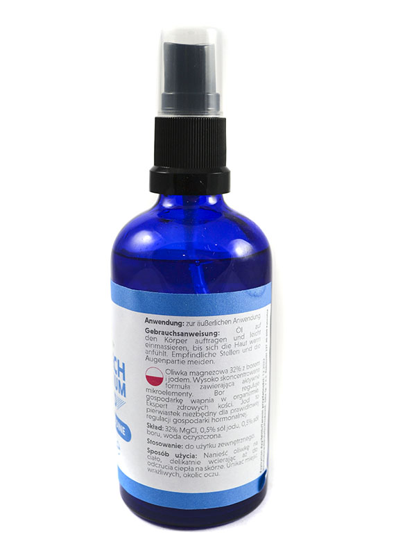 MAGZECH Olejek magnezowy 32% bor+jod 100 mlMineralizator magnezowy do ciała. Wysokoskoncentrowany olejek zawierający aktywny magnez. Stosowany w kosmetyce, masażach, przy intensywnym uprawianiu sportu oraz do szybkiej suplementacji magnezu. Produkt pochodzenia naturalnego.Olejek zawiera dodatki wzbogacające formułę o bor i jod. Mikroelementy znacznie wzmacniają oddziaływanie magnezu oraz uzupełniają niedobory tych elementów. Wysoko skoncentrowana formuła zawierająca aktywne mikroelementy. Bor reguluje gospodarkę wapnia w organizmie. Ekspert zdrowych kości. Jod to pierwiastek niezbędny dla prawidłowej regulacji gospodarki hormonalnej. Skład: 32% MgCl, 0,5% sól jodu, 0,5% sól boru, woda oczyszczona. Produkt sporządzany jest z najwyższej jakości surowców. Do produkcji w naszym laboratorium stosowana jest ultraczysta woda dejonizowana, wytwarzana metodą podwójnej osmozy. Stosowany chlorek magnezu posiada wysoką czystość i pozbawiony jest szkodliwych dodatków. Uwaga:Przechowywać w miejscu niedostępnym dla małych dzieci. Unikać kontaktu z oczami. W przypadku kontaktu z oczami przemyć dużą ilością wody. Przechowywać w szczelnym zamknięciu powyżej 5 °C, aby uniknąć tworzenia kryształów. Stosowanie:Olej magnezowy może być z powodzeniem stosowany codziennie zarówno profilaktycznie, jak i docelowo. Jego regularna aplikacja szczególnie polecana jest osobom mającym problemy skórne. Aktywni fizycznie powinny stosować go po każdym treningu, a alergicy codziennie przez cały okres pylenia. Aplikacja olejku magnezowego jest łatwa. Co ważne, olejek bardzo szybko się wchłania.Olejek można dowolnie rozcieńczać wodą. Należy unikać kontaktu z oczami. Przechowywać w temperaturze pokojowej.