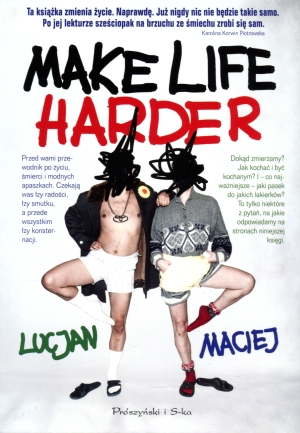 Przed wami Make Life Harder"", czyli 350 stron o tym, jak się zachowywać na rynku, co robić z rękoma w windzie, gdzie siadać na dworcu i jak wychodzić z psem, żeby to wszystko miało ręce i nogi, i łapy. Słowem przewodnik po życiu.Ale jest więcej słów, którymi można opisać tę książkę. Dobra być może nie jest jednym z nich. Nie czepiajmy się jednak słówek. Kiedyś pewien mądry człowiek powiedział, że życie jest jak Karkonosze niby ładne widoczki i wszystko spoko, ale jak nie masz przewodnika, to prędzej czy później spadniesz w przepaść albo zje cię niedźwiedź. Ta książka jest właśnie przewodnikiem po Karkonoszach życia. Dokąd zmierzamy? Jak kochać i być kochanym? I co najważniejsze jaki pasek do jakich lakierków? To tylko niektóre z pytań, na jakie odpowiadamy na stronach niniejszej księgi. Razem będziemy płakać i śmiać się. Razem będziemy kotłować się w śpiworku pod gwiaździstym niebem.PS Tak naprawdę to nie jest przewodnik po Karkonoszach. Jeśli nie chcecie, żeby niedźwiedź was skonsumował, to kupcie prawdziwy przewodnik. Albo nie jedźcie w góry. Pojedźcie do Rowów albo coś.Czytałam, umarłam ze śmiechu i zmartwychwstałam jako lepszy człowiek, choć jako Koziorożec poczęty w kwietniu, a urodzony w styczniu, miesiącu zimnego podniecenia seksualnego, mam przechlapane. Make life harder"" to niepowtarzalny, 350-stronicowy, poradnik rebours o tym, jak żyć. Moje życie po tej książce nigdy nie będzie takie samo. Wasze też.Karolina Korwin Piotrowska, TVN StyleMake Life Harder"", czyli Maciej i Lucjan samozwańczy eksperci zajmujący się złożoną problematyką lifestyle'u, mody i urody oraz mniej istotnymi zagadnieniami społeczno-egzystencjalnymi, takimi jak religia, polityka, przemijanie i śmierć. Ze względu na nieprzerwane pasmo spektakularnych sukcesów, zwani Jolą Rutowicz polskiej blogosfery. Są nieustającym rozczarowaniem dla swoich rodziców, nauczycieli i przyjaciół, a przede wszystkim dla samych siebie. Urodzeni i wychowani w Gdańsku, a konkretnie w Polsce.
