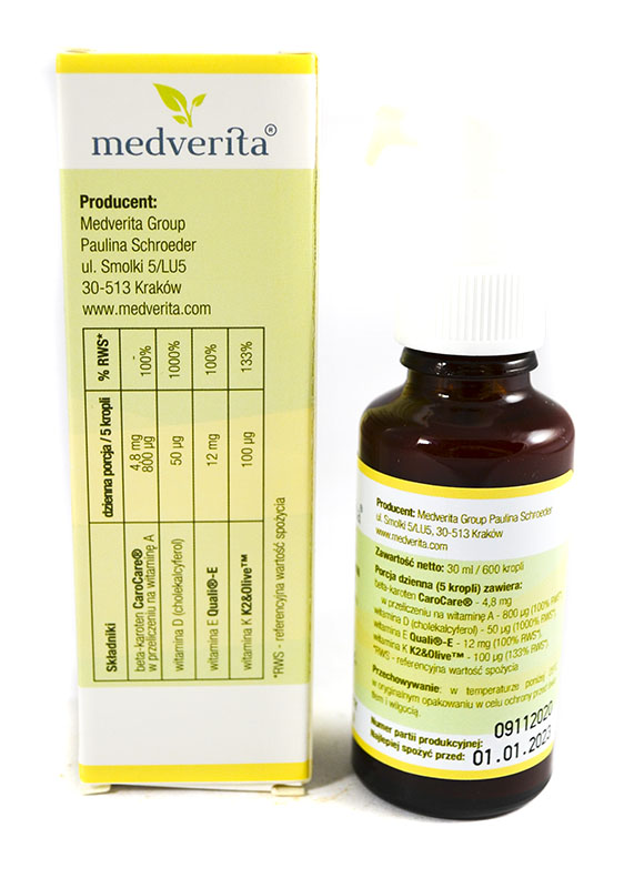 Przechowywanie:w temperaturze poniżej 25°C, w oryginalnym opakowaniu w celu ochrony przed światłem i wilgocią. Wartości odżywcze Medverita Witamina ADEK 30mlSuplement diety