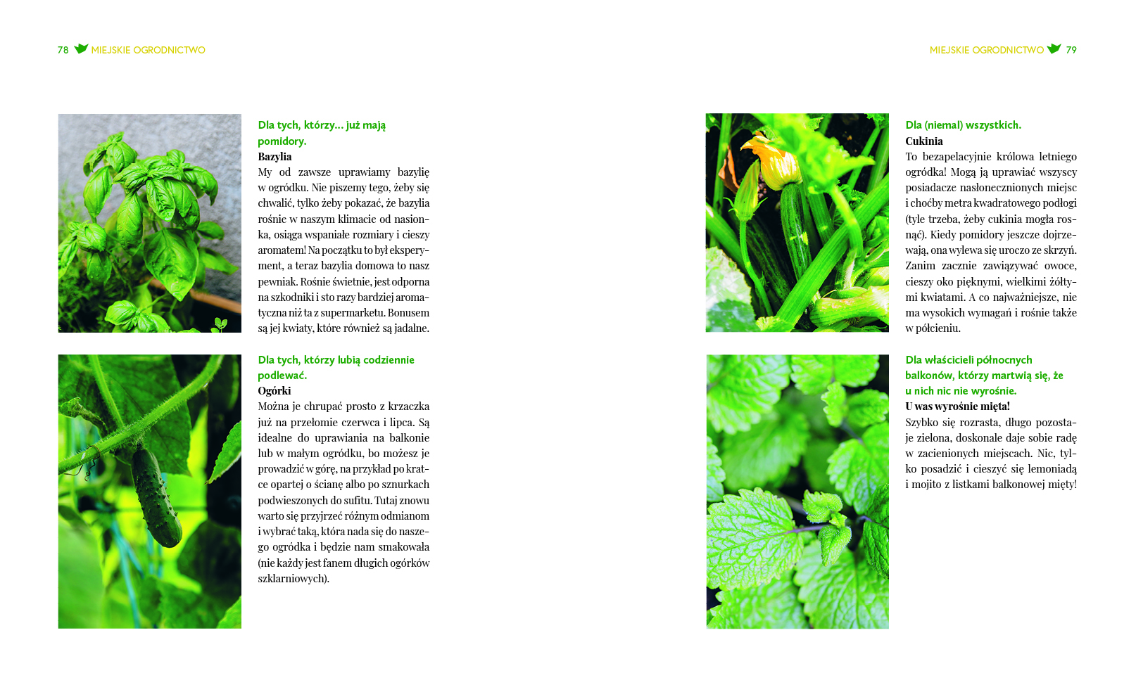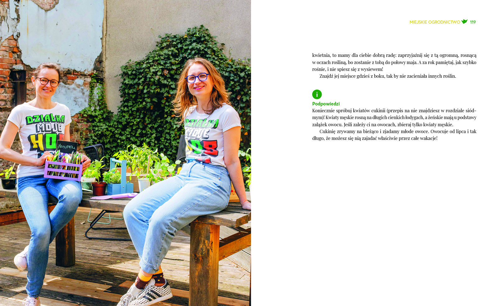 Mieszkasz w mieście, ale marzysz o samodzielnie wyhodowanym pomidorze czy szpinaku? Nic prostszego!  Witaj w świecie miejskiego ogrodnictwa! Mnóstwo tutaj doniczek, nasion, pomidorów, truskawek i zarośniętych balkonów. Jest też trochę ziemi pod paznokciami i zalanych parapetów, ale wierzymy, że i tak ci się spodoba.  Napisałyśmy tę książkę, żeby zaprosić cię do zielonego świata w mieście. Do magicznej krainy ze szczęśliwymi ludźmi, która naprawdę istnieje. Nie wierzysz? Stwórz nawet najmniejszy ogródek na parapecie i obserwuj, jak rosną rośliny, a przekonasz się, ile radości daje uprawianie i zjadanie (!) własnych warzyw.