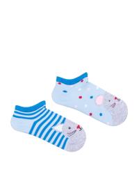 Skarpetki Milena z serii Joy to idealna zabawa na stopkach! Dwie skarpetki turkusowe, jedna przyozdobiona w myszkę i kropeczki, a druga w kotka i paski. Skarpetki zapewniają wysoki komfort noszenia.