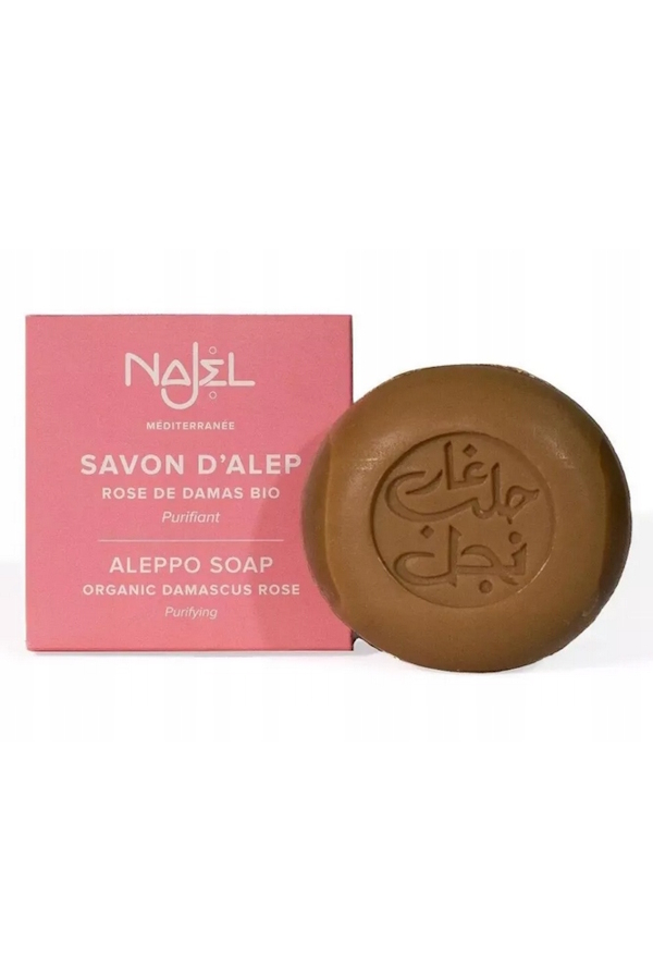 NAJEL Mydło z Aleppo 12% oleju laurowego z różą damasceńską bio 100gMydło Aleppo jest wytwarzane na bazie oliwy z oliwek z dodatkiem oleju laurowego (12%), dlatego nie powoduje alergii, a używane regularnie łagodzi wysuszenia skóry i pozostawia ją dobrze nawilżoną. Nie jest perfumowane, naturalnie pachnie olejem laurowym i oliwa z oliwek.