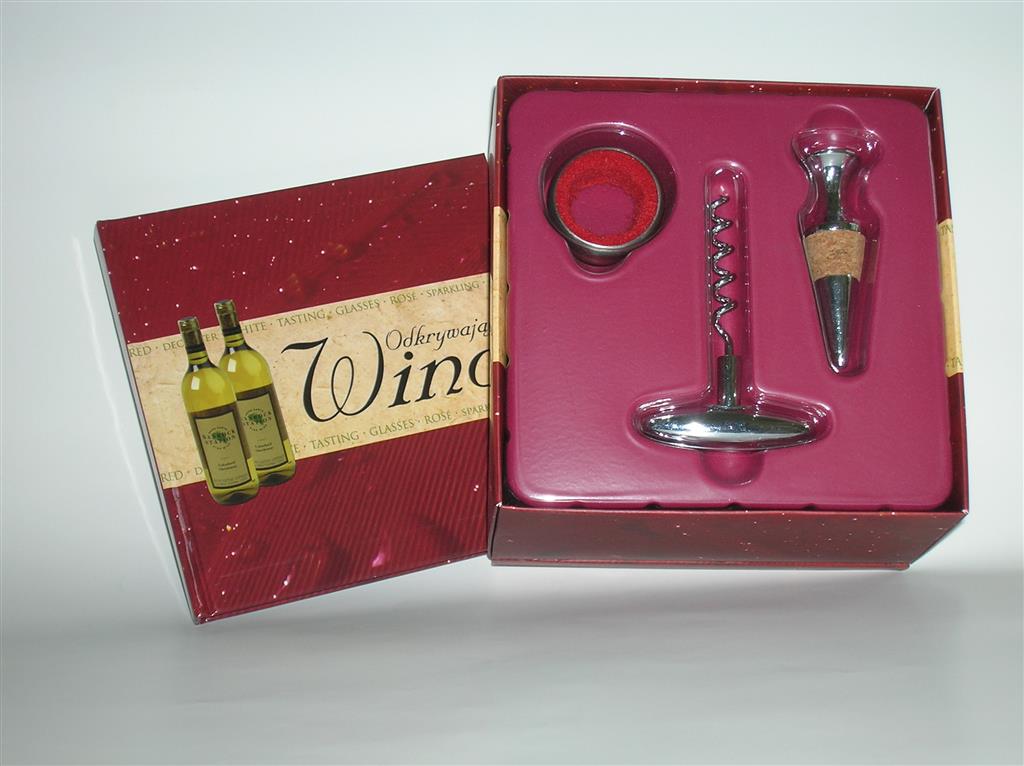 Przewodnik po świecie win. Zawiera praktyczne informacje o różnych gatunkach win takie jak: kraj pochodzenia, produkcja, przechowywanie itp. Do książki dołączono dobrej jakości korkociąg, korek oraz niekapkę.