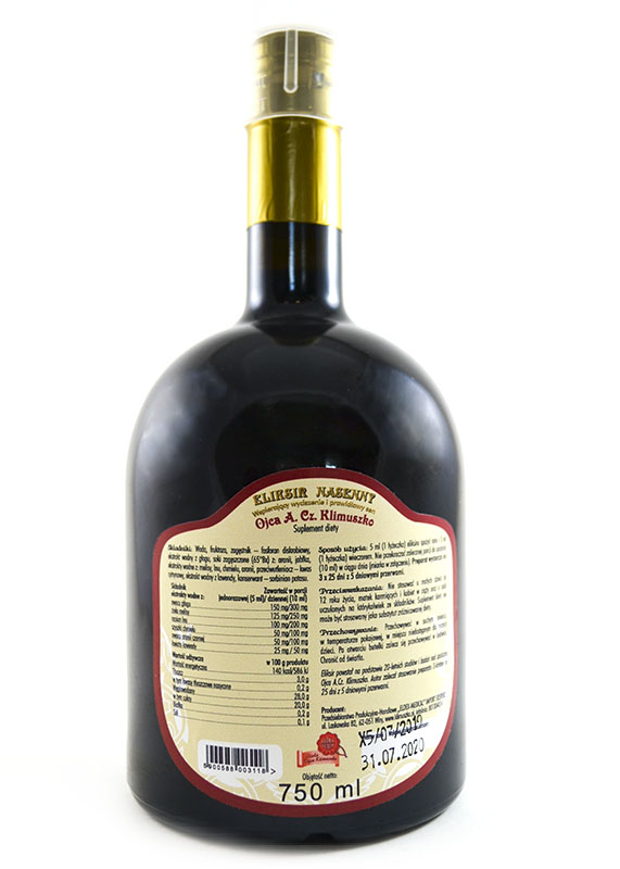 Ojciec Klimuszko Eliksir nasenny 750mlBezalkoholowy eliksir nasenny, stworzony na bazie oryginalnej receptury Ojca Klimuszko. Stosowany regularnie oferuje ochronę i wspomaganie w zakresie wyciszenia, łagodzenia stresu i zasypiania. Ma również pozytywny wpływ na poprawę procesów trawiennych. Eliksir nasenny Ojca Klimuszko zapewnia kompleksowa ochronę i wspomaganie w zakresie ułatwiania zasypiania, łagodzenia stresu i napięć nerwowych, tonizowania organizmu i poprawy procesów trawienia. Dostarcza niezbędnych substancji prozdrowotnych (witaminy, bioflawonoidy). Eliksir jest oparty na w pełni naturalnych ekstraktach owoców i ziół. Produkt jest bezpieczny dla osób z cukrzycą typu I i II. Nie zawiera alkoholu. Butelka 750 ml starcza na trzymiesięczną kurację.Stosowanie: