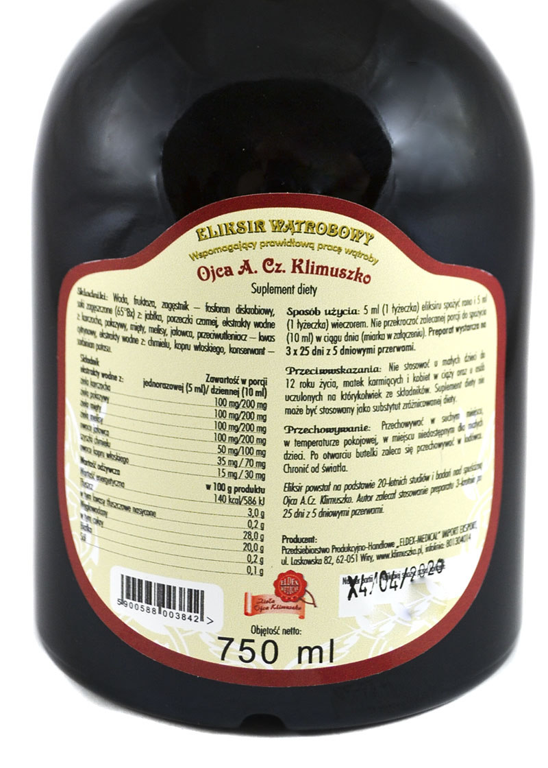 Ojciec Klimuszko Eliksir wątrobowy wspomagający prawidłową pracę wątroby 750mlEliksir powstał na podstawie 20-letnich studiów i badań nad spuścizną Ojca A. Cz. Klimuszko. Autor zalecał stosowanie preparatu 3-krotnie po 25 dni z 5 dniowymi przerwami. Eliksir Wątrobowy A.Cz. Klimuszko jest oparty o naturalne zioła i ekstrakty owocowe. Stosowanie:5 ml (1 łyżeczka) eliksiru spożyć rano i 5 ml wieczorem. Nie przekraczać zalecanej porcji do spożycia (10 ml) w ciągu dnia (miarka w załączeniu). Preparat wystarcza na 3 x 25 dni z 5 dniowymi przerwami. Skład:Woda, fruktoza, zagęstnik 0 fosforan diskrobiowy, soki zagęszczone (65°Bx) z: jabłka, porzeczki czarnej, ekstrakty wodne z: karczoch, pokrzywy, mięty, melisy, jałowca, przeciwutleniacz - kwas cytrynowy, ekstrakty wodne z: chmielu, kopru włoskiego, konserwant - sorbinian potasu. Przeciwskazania:Nie stosować u małych dzieci do 12 roku życia, matek karmiących i kobiet w ciąży oraz u osób uczulonych na którykolwiek ze składników. Suplement diety nie może być stosowany jako sybstytut zróżnicowanej diety. Przechowywanie:Przechowywać w suchym miejscu, w temperaturze pokojowej, w miejscu niedostępnym dla małych dzieci. Po otwarciu butelki zaleca się przechowywać w lodówce. Chronić od światła. Ojciec Klimuszko Eliksir wątrobowy wspomagający prawidłową pracę wątroby 750mlSuplement diety Wartość odżywacza w 100g produktu: Wartość energatyczna 140 kcal/586 kJ, Tłuszcz 3,0g, w tym kwasy tłuszczowe nasycone 0,2g, Węglowodany 28,0g, w tym cukry 20,g, Białko 0,2g, Sól 0,1g.