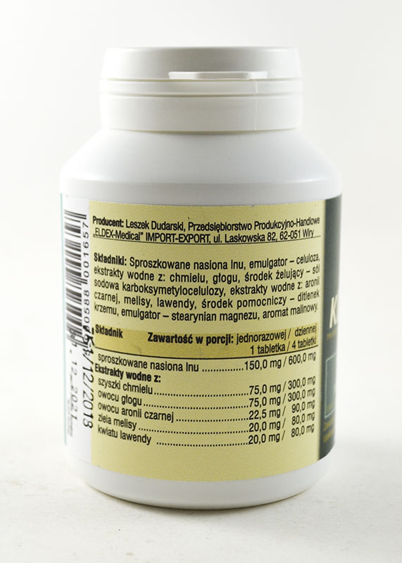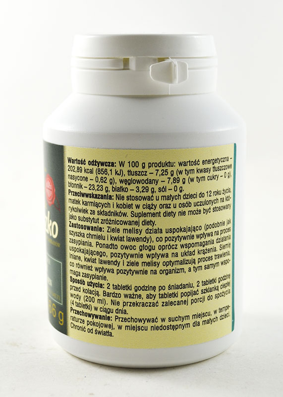Ojciec Klimuszko Tabletki wspierające wyciszenie i prawidłowy sen 120tablSposób użycia:2 tabletki godzinę po śniadaniu i 2 tabletki godzinę przed przed kolacją,popijać szklanką (200 ml) ciepłego napoju. Nie przekraczać porcji 4 tabletek w ciągu doby. Nie stosować u małych dzieci (do 12 roku życia), matek karmiących i kobiet w ciąży. Preparat nie może być stosowany jako substytut zróżnicowanej diety. Skład:Sproszkowane nasiona lnu, emulgator-celuloza, ekstrakty wodne z : chmielu, głogu, środek żelujący-sól sodowa karboksymetylocelulozy, ekstrakty wodne z : aronii czarnej, melisy, lawendy, środek pomocniczy-ditlenek krzemu, emulgator-stearynian magnezu, aromat malinowy.Przechowywać w suchym miejscu, w temperaturze pokojowej, chronić od światła, w miejscu niedostępnym dla małych dzieci. Suplement diety nie może być substytutem zróżnicowanej diety. Wartości odżywcze Ojciec Klimuszko Tabletki wspierające wyciszenie i prawidłowy senSuplement diety