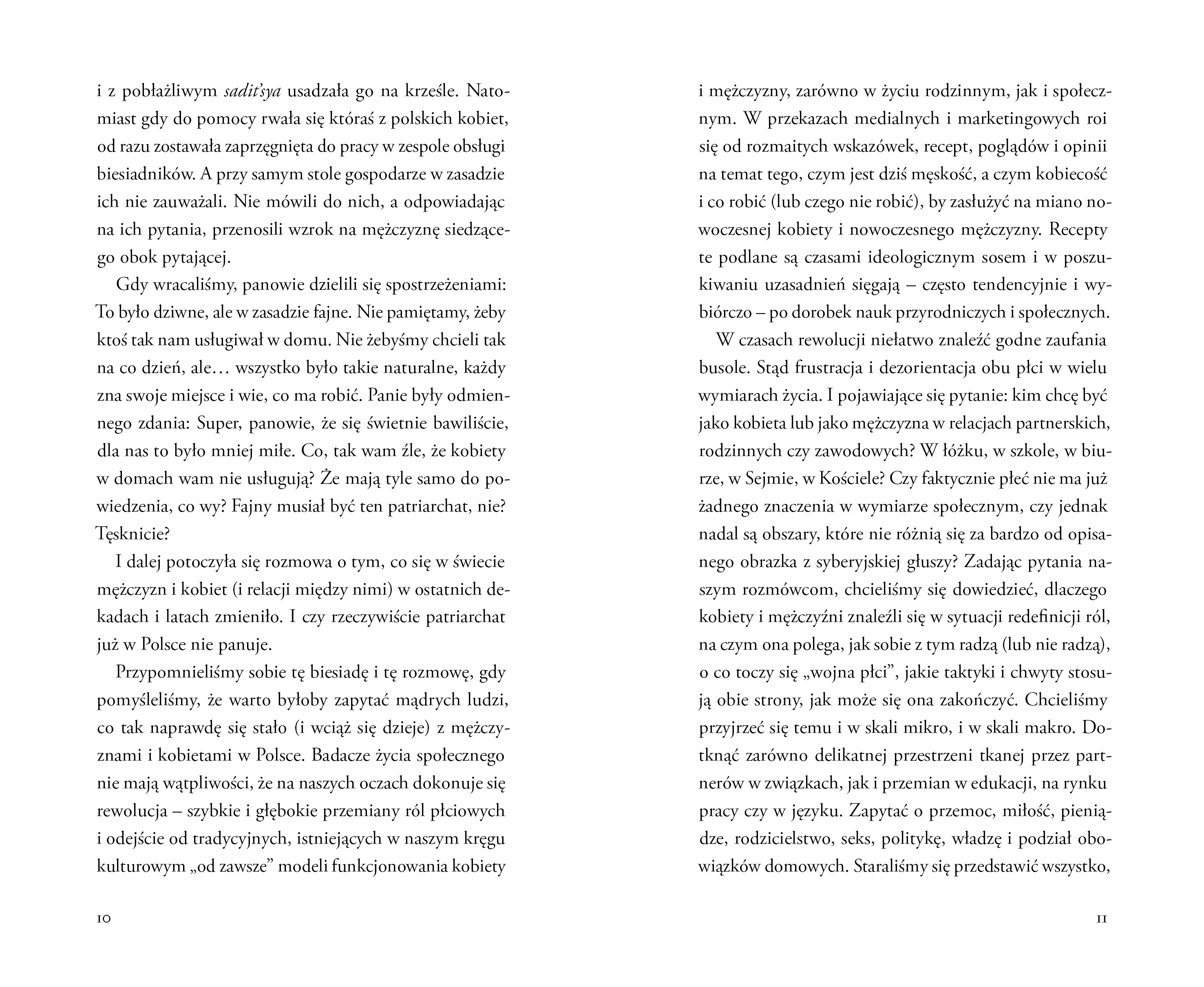 43% osób na stanowiskach menadżerskich w Polsce to kobiety - to drugi najlepszy wynik w Europie. Tylko dlaczego jeszcze niedawno mieliśmy w polskim rządzie więcej ministrów o imieniu Mariusz niż kobiet? Czy płeć rzeczywiście nie ma już żadnego znaczenia? A może właśnie grozi nam wojna płci? O co walczą feministki, a czego nie chcą uznać obrońcy patriarchatu? Czemu niektóre kobiety nie lubią feminatywów? I jak równouprawnienie wpływa na seks? Na naszych oczach rozgrywa się spóźniona rewolucja i pierwsza prawdziwa dyskusja o rolach kobiet i mężczyzn. Wojciech Harpula i Maria Mazurek przyglądają się temu, co dzieje się w naszych domach i w przestrzeni publicznej - edukacji, polityce i języku. Autorzy prowadzą nieoczywiste i prowokujące rozmowy, w których pytają o podział obowiązków, przemoc, miłość, pieniądze i władzę. Odpowiadają m.in. Bogdan de Barbaro, Andrzej Depko, Zuzanna Radzik i Ewa Woydyłło-Osiatyńska. W łóżku, szkole, biurze, Sejmie czy kościele - co w Polsce znaczy dziś bycie kobietą i bycie mężczyzną? Brak recenzjix