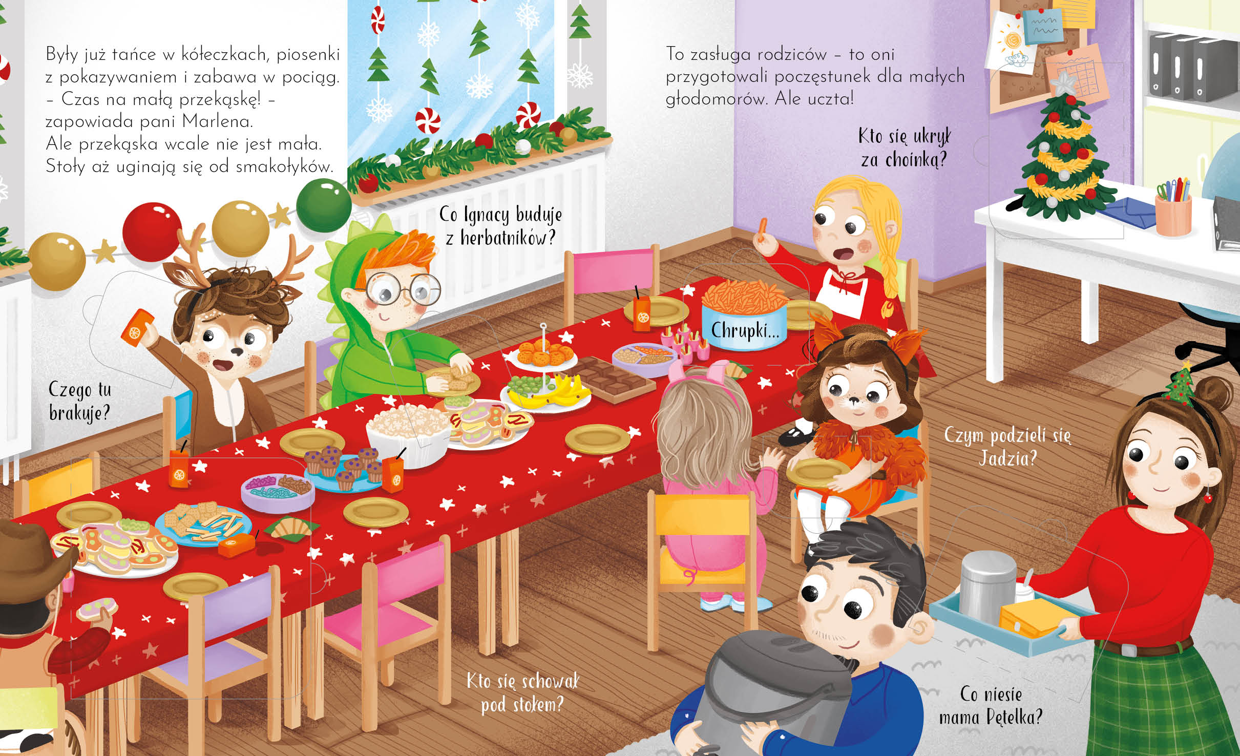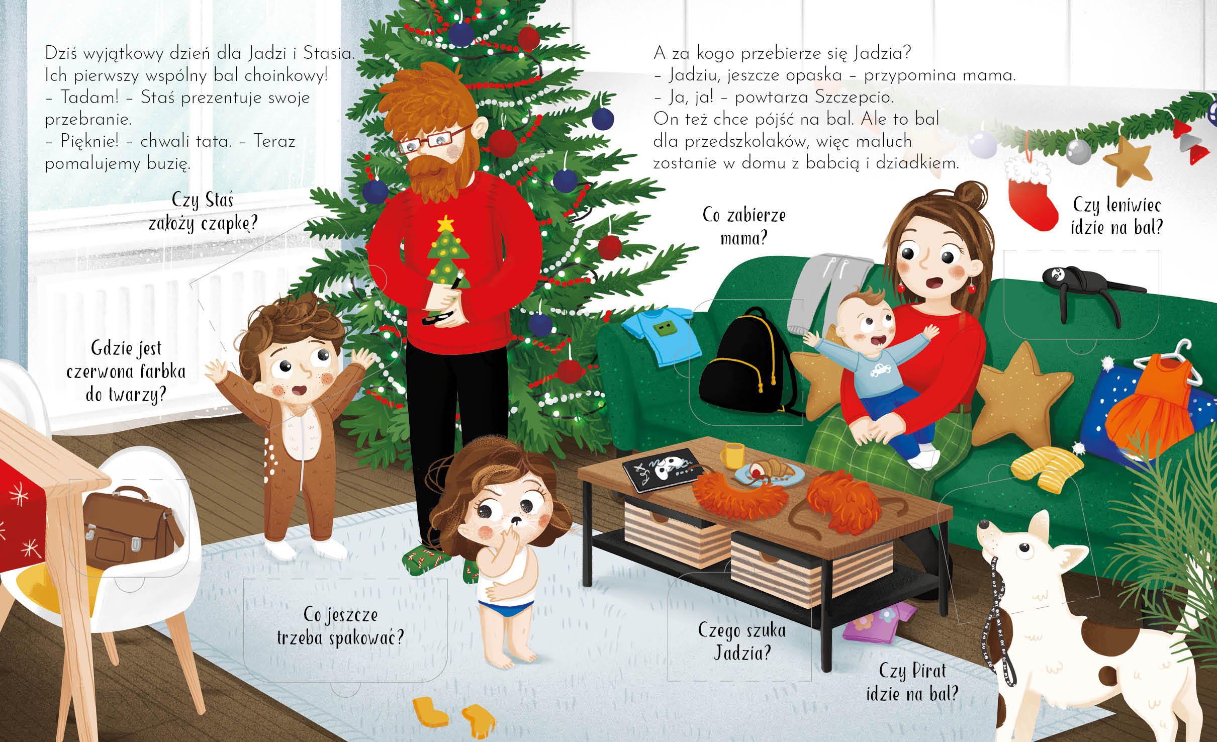 Nadeszły święta! W przedszkolu Jadzi i Stasia Pętelków odbędzie się wielki bal choinkowy. Dzieci włożą zabawne kostiumy, będą tańczyć i zajadać smakołyki. Ale najbardziej nie mogą się doczekać spotkania z Mikołajem! Za kogo przebiorą się przedszkolaki? Czy leniwiec też pójdzie na bal? Czy Mikołaj przyniesie prezenty? Jaką niespodziankę sprawi dzieciom tata? Czytajcie i otwierajcie okienka, żeby się tego dowiedzieć. "Pętelkowy bal choinkowy" to duża kartonowa książka z okienkami, która zapewni najmłodszym świetną zabawę, a przy okazji pomoże ćwiczyć orientację przestrzenną oraz nazywanie przedmiotów. Na każdej rozkładówce rozmieszczono kilka otwieranych okienek, pod którymi ukryte zostały przedmioty nawiązujące do tekstu. Brak recenzjix