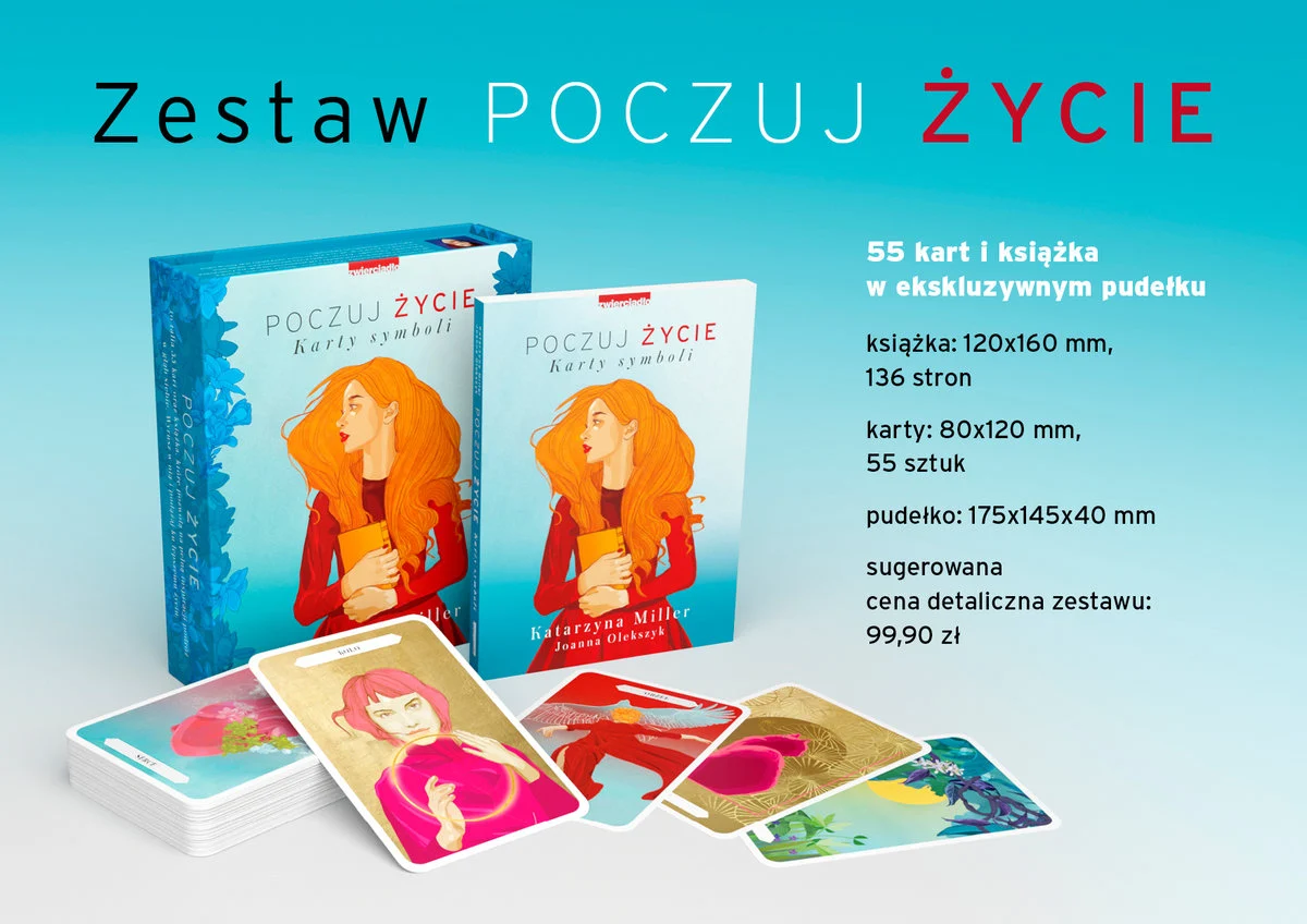 Poczuj życie to pełna inspiracji podróż w głąb siebie. Wyrusz w nią i podążaj ku lepszemu życiu. „To znaki i symbole rządzą światem, a nie słowa czy prawa” – twierdził chiński mędrzec Konfucjusz. Carl Gustav Jung to właśnie od nich zaczynał tłumaczenie ludzkiej psychiki, zaś Zygmunt Freud jako pierwszy zauważył, że sny są symboliczne. Symbole mają nad nami władzę, której sobie nawet nie uświadamiamy. Stale nam towarzyszą. Jako ludzie mamy wspólne symbole, zwane archetypami; ale każdy z nas ma też symbole indywidualne, związane tylko z jego historią. Jak je interpretować i jak dzięki nim wzmocnić swój wewnętrzny potencjał? Pomogą Ci w tym Katarzyna Miller i Joanna Olekszyk, a także stworzona przez nie talia kart oraz inspirująca książka Poczuj życie. Katarzyna Miller Najsłynniejsza polska psycholożka. Charyzmatyczna, odważna, dowcipna i pogodna, ale też szczera do bólu. Psychoterapeutka z kilkudziesięcioletnią praktyką terapeutyczną. Ukończyła psychologię i filozofię na UW. Treningu psychologicznego i prowadzenia psychoterapii uczyła się w Ośrodku Synapsis od prof. dr. hab. Kazimierza Jankowskiego, a następnie od rzeszy nauczycieli polskich i zagranicznych (w tym Carla Rogersa). Wykładowczyni na licznych warsztatach rozwojowych dla kobiet. Felietonistka miesięcznika „Zwierciadło”. Autorka i współautorka wielu bestsellerowych poradników, m.in. Chcę być kochana tak, jak chcę, Nie bój się życia, Instrukcja obsługi faceta, Kup kochance męża kwiaty, Poznaj siebie. Karty emocji (Wydawnictwo Zwierciadło). Joanna Olekszyk Dziennikarka, redaktor naczelna miesięcznika „Zwierciadło”. Absolwentka polonistyki i dziennikarstwa UW. Współautorka książek, m.in. Daj się pokochać dziewczyno, To Twoje życie. Pokochaj je oraz Poznaj siebie. Karty emocji (Wydawnictwo Zwierciadło). Brak recenzjix
