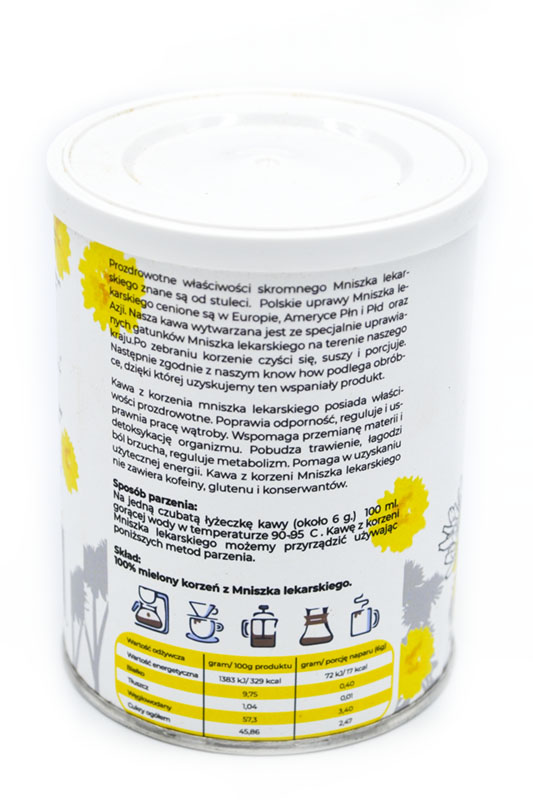 Skład: Kawa bezkofeinowa, 100% mielony korzeń z mniszka lekarskiego