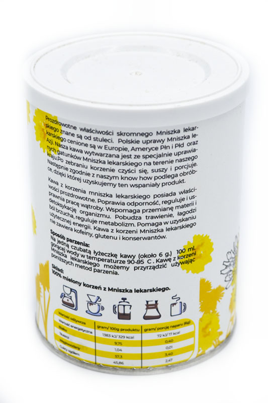 Sposób parzenia:Na jedną czubatą łyżeczkę kawy (około 6 g) 100 ml gorącej wody w temperaturze 90- 95'C. Kawę z korzenia mniszka lekarskiego można przyrządzić używając następujących metod parzenia: ekspres przelewowy, drip, zaparzacz (French Press), Chemex, tradycyjna metoda parzenia (zalewajka). Skład: