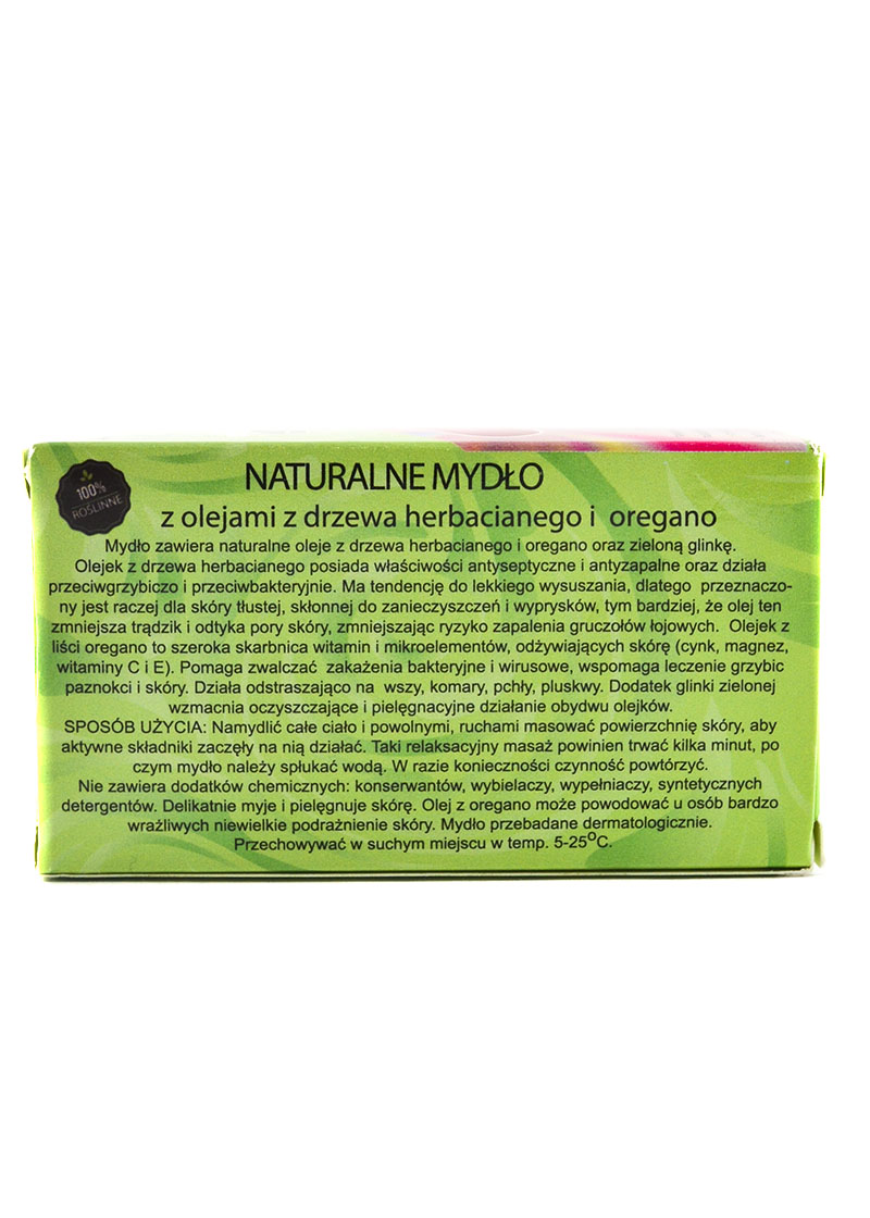 Powrót do Natury Mydło z drzewem herbacianym i oregano 100gOlejek z liści oregano to szeroka skarbnica witamin i mikroelementów, odżywiających skórę (cynk, magnez, witaminy C i E). Olejek z drzewa herbacianego posiada własności antyseptyczne i antyzapalne oraz działa przeciwgrzybiczo i przeciwbakteryjnie. Ma tendencję do lekkiego wysuszania, dlatego raczej przeznaczony jest dla skóry tłustej, skłonnej do zanieczyszczeń i trądziku, tym bardziej, że olej ten zmniejsza trądzik i odtyka pory skóry, zmniejszając ryzyko zapalenia gruczołów łojowych. Olejek oregano zwalcza zakażenia bakteryjne i wirusowe, wspomaga leczenie grzybic paznokci i skóry. Działa odstraszająco i eliminuje pasożyty skóry: wszy, komary, pchły, pluskwy. Dodatek glinki zielonej wzmacnia oczyszczające i pielęgnacyjne działanie obydwu olejków. Produkowane według tradycyjnej receptury z roślinnych, naturalnych surowców najwyższej jakości. Idealne do pielęgnacji skóry przetłuszczonej i trądzikowej.Sposób użycia:Namydlić całe ciało i powolnymi, ruchami masować powierzchnię skóry, aby aktywne składniki zaczęły przez nią przenikać w głąb ciała. Taki relaksacyjny masaż powinien trwać kilka, kilkanaście minut, po czym mydło należy spłukać wodą.Skład INCI:Sodium Palmate, Sodium Palm Kernelate, Aqua, Sodium Chloride, Glycerin, Sodium Hydroxide, Illite (green clay), Melaleuca Alternifolia Oil, Origanum Majorana OilW trakcie leżakowania lub uzywania mydeł mogą pojawić się na nich drobne peknięcia i zmiana odcienia, co jest zjawiskiem normalnym dla naturalnych mydeł bez syntetycznych wypełniaczt, substancji uplastyczniających.