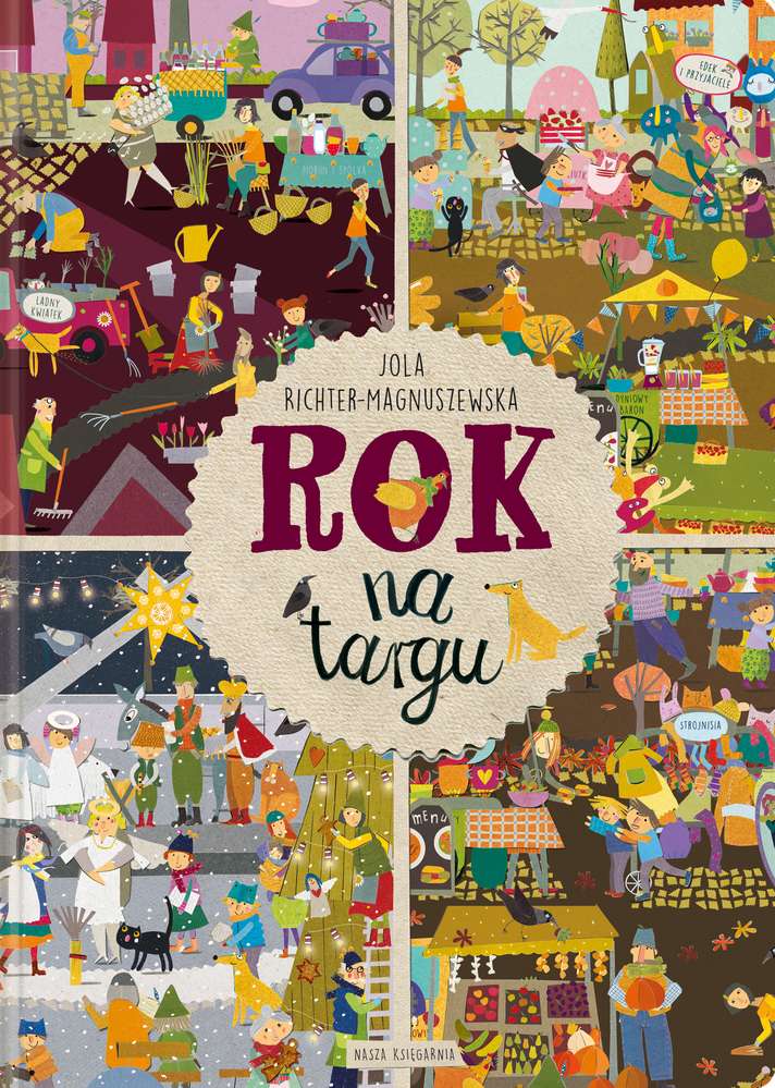Iza z Krisem sprzedają miód, wełnę i mleko, a także jogurty, sery i przetwory własnej produkcji. Dyniowy Baron przywozi na rowerze ugotowane przez siebie wegetariańskie potrawy. Pani Słodziutka piecze najwspanialsze ciasta, a jej mąż, Pan Słodziutki, słynie z wyrobu lodów. Dorota szyje niezwykłe zabawki. Zielarka Skrzatula zbiera zioła, z których robi uzdrawiające mikstury. Ceramicy Agnieszka i Willi prowadzą warsztaty, na których każdy może zrobić sobie kubek. Ala i Anka opiekują się psiakami i kotami. Pan Mietek Wróbel pilnuje porządku. Jest i para nowych sprzedawców, Grażynka i Janusz, którzy wprowadzą trochę zamieszania. Mamy też całą gromadę zwierząt: kurę Rebekę, psotnego osła Pioruna i kota Paragona. Kawki podkradają jedzenie, a bociany przylatują i odlatują zgodnie z prawami natury. No i oczywiście są tu dzieci niektóre chętnie wyręczają rodziców w sprzedaży, inne się bawią, a jeszcze inne pomagają znajomym starszym osobom robić zakupy. Rok na targu zawiera dwanaście rozkładówek pokazujących cykliczność i sezonowość lokalnych produktów. Prześledzimy, co słychać u wytwórców i mieszkańców Dobroszyc, potowarzyszymy im w obchodach radosnych świąt, takich jak Dzień Dziecka czy Dzień Kota. Dodatkowe dwie ilustracje są poświęcone prezentacji bohaterów oraz interaktywnej zabawie. Jola Richter-Magnuszewska maluje, rysuje i wycina ilustracje do książek i Świerszczyka. Temat Roku na targu, swojej pierwszej książki autorskiej, zna od podszewki. W Beskidzie Niskim, gdzie mieszka, idea cotygodniowych targów jest ciągle żywa. Regularnie bierze w nich udział zarówno jako stała bywalczyni, jak i wystawca. Jej pracownia Z Innej Bajki, prowadzona wspólnie z mężem, gościła na wielu jarmarkach w kraju i zagranicą. Brak recenzjix