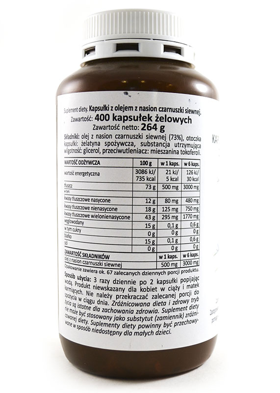 Warunki przechowywania:Chronić od światła, przechowywać w temperaturze pokojowej poniżej 25° C, w chłodnym i suchym miejscu niedostępnym dla małych dzieci.Wartości odżywcze Sanct Bernhard Olej z czarnuszki kminku czarnego 500mg 400kapsSuplement diety