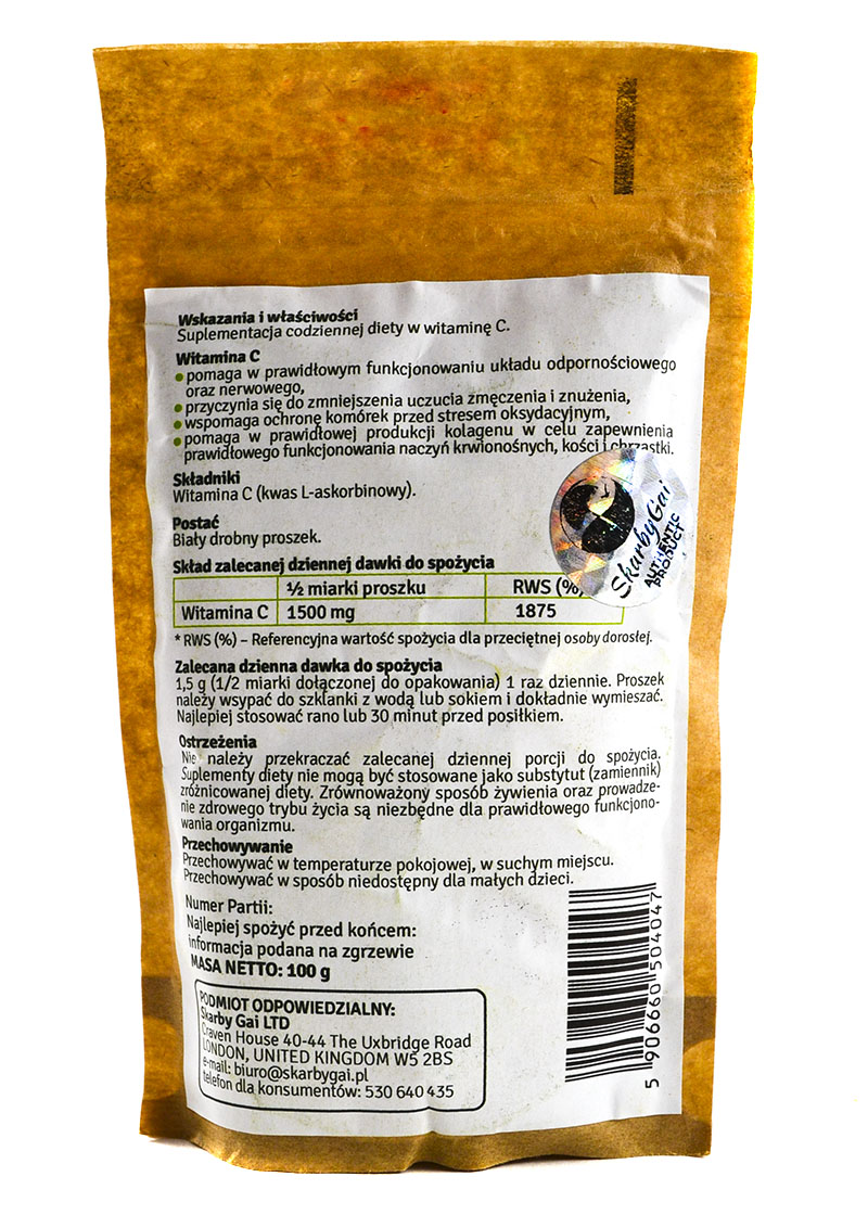 Skarby Gai Witamina C Kwas L-Askorbinowy z kapusty 100gKwas L-askorbinowy. Produkt pozyskany z kapusty i naturalnych składników roślinnych. Wyprodukowany metodą dwustopniowej BI-Fermentacji.Wskazania i właściwości: suplementacja codziennej diety w witaminę C. Witamina C: - pomaga w prawidłowym funkcjonowaniu układu odpornościowego oraz nerwowego - przyczynia się do zmniejszenia uczucia zmęczenia i znużenia - wspomaga ochronę komórek przed stresem oksydacyjnym - pomaga w prawidłowej produkcji kolagenu w celu zapewnienia prawidłowego funkcjonowania naczyń krwionośnych, kości i chrząstek Składniki:Witamina C (kwas L-askorbinowy)Sposób użycia:Zalecana dzienna dawka do spożycia:1,5 g (1/2 miarki dołączonej do opakowania) 1 raz dziennie. Proszek należy wsypać do szklanki z wodą lub sokiem i dokładnie wymieszać. Najlepiej stosować rano lub 30 minut przed posiłkiem. Ostrzeżenia: Nie należy przekraczać zalecanej dziennej porcji do spożycia. Suplementy diety nie mogą być stosowane jako substytut (zamiennik) zróżnicowanej diety. Zrównoważony sposób żywienia oraz prowadzenie zdrowego trybu życia są niezbędne dla prawidłowego funkcjonowania organizmu. Wartości odżywcze Skarby Gai Witamina C Kwas L-Askorbinowy z kapusty 100gSuplement diety