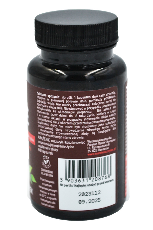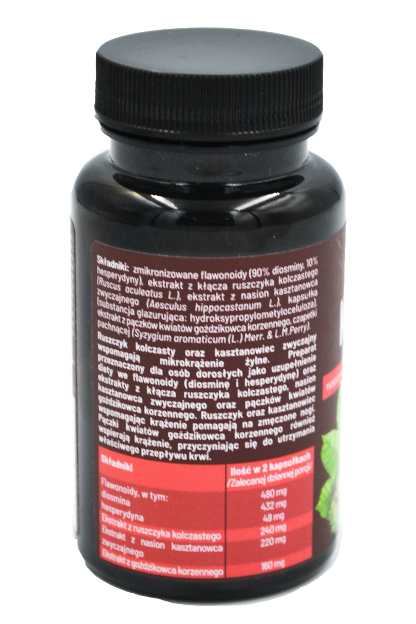 Składniki:Zmikronizowane flawonoidy (90% diosminy, 10% hesperydyny), ekstrakt z kłącza ruszczyka kolczastego (Ruscus aculeatus L.), ekstrakt z nasion kasztanowca zwyczajnego (Aesculus hippocastanum L.), substancja wypełniająca (celuloza), kapsułka (substancja glazurująca: hydroksypropylometyloceluloza), ekstrakt z pączków kwiatów goździkowca korzennego, czapetki pachnącej (Syzygium aromaticum (L.) Merr. & L.M.Perry). Spożycie: