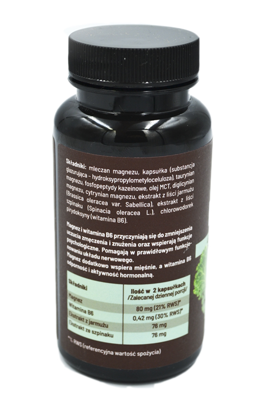 ZALETY: mleczan magnezu, kapsułka (substancja glazurująca - hydroksypropylometyloceluloza), taurynian magnezu, fosfopeptydy kazeinowe, olej MCT, diglicynian magnezu, cytrynian magnezu, ekstrakt z liści jarmużu (Brassica oleracea var. Sabellica), ekstrakt z liści szpinaku (Spinacia oleracea L.) chlorowodorek pirydoksyny (witamina B6).