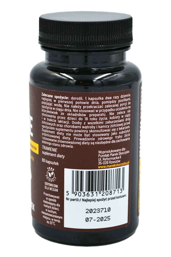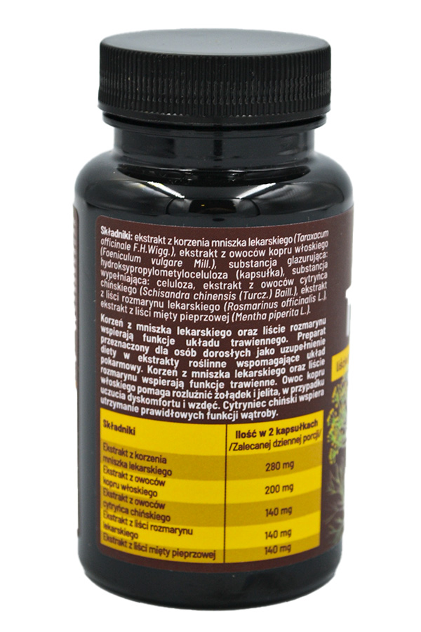 Składniki:Ekstrakt z korzenia mniszka lekarskiego (Taraxacum officinale F.H.Wigg.), ekstrakt z owoców kopru włoskiego (Foeniculum vulgare Mill.), substancja glazurująca: hydroksypropylometyloceluloza (kapsułka), substancja wypełniająca: celuloza, ekstrakt z owoców cytryńca chińskiego (Schisandra chinensis (Turcz.) Baill.), ekstrakt z liści rozmarynu lekarskiego (Rosmarinus officinalis L.), ekstrakt z liści mięty pieprzowej (Mentha piperita L.). Spożycie: