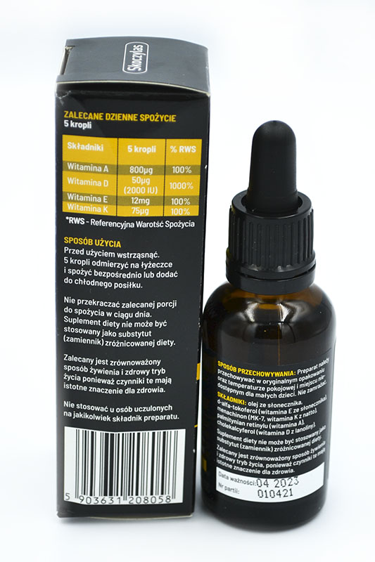 Skoczylas Witamina ADEK 30mlZALETY:- ciemnobrązowa buteleczka, zabezpiecza przed zniszczeniem substancji czynnych przez światło UV - starannie wyselekcjonowane źródło surowców - nie zawiera substancji konserwujących - nie zawiera sztucznych barwników SKŁADNIKI: - witamina E ze słonecznika (D-alfa-tokoferol) - witamina K2Mk7 z natto (menachinon-7) - witamina A (palmitynian retinylu) - witamina D3 z lanoliny (cholekalcyferol) - olej słonecznikowy ZALECANA DZIENNA PORCJA: Przed użyciem wstrząsnąć. 5 kropli odmierzyć na łyżeczce i spożyć bezpośrednio lub dodać do chłodnego posiłku. Nie przekraczać zalecanej porcji do spożycia w ciągu dnia. SPOSÓB PRZECHOWYWANIA: Preparat należy przechowywać w oryginalnym opakowaniu oraz temperaturze pokojowej i miejscu niedostępnym dla małych dzieci. Nie zamrażać. WAŻNE UWAGI: Nie stosować u osób uczulonych na jakikolwiek składnik preparatu. Suplement diety nie może być stosowany jako substytut (zamiennik) zróżnicowanej diety. Kobiety w ciąży oraz w okresie karmienia przed zastosowaniem powinny skonsultować się z lekarzem. ILOŚĆ: - 30 ml (900 kropli) zawiera 180 sugerowanych dziennych porcji po 5 kropli. Skoczylas Witamina ADEK 30ml