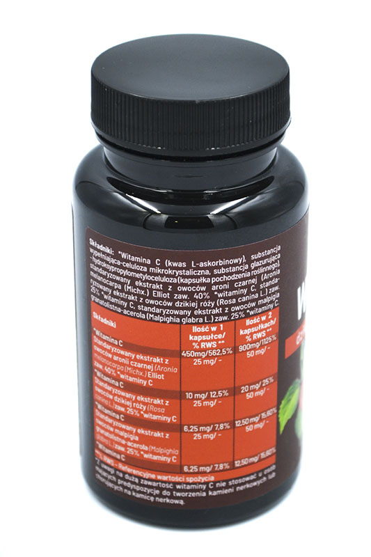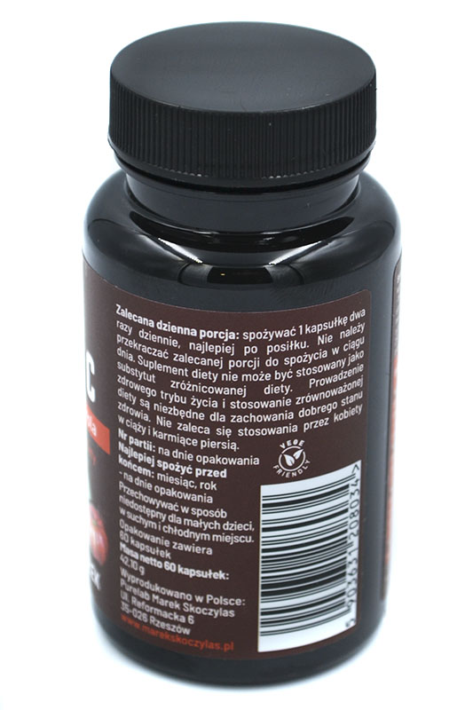 Skoczylas Witamina C trio 60kapsZALETY:- starannie wyselekcjonowane źródło surowca - nie zawiera substancji konserwujących - nie zawiera przeciwzbrylaczy - nie zawiera sztucznych barwników (przezroczysta kapsułka) - czarny słoiczek, zabezpiecza przed zniszczeniem substancji czynnych przez światło UV - kapsułka pochodzenia roślinnego SKŁADNIKI: *Witamina C (kwas L-askorbinowy), substancja wypełniająca - celuloza mikrokrystaliczna, substancja glazurująca-hydroksypropylometyloceluloza (kapsułka pochodzenia roślinnego), standaryzowany ekstrakt z owoców aronii czarnej (Aronia melanocarpa (Michx) Elliot) zaw. 40% *witaminy C, standaryzowany ekstrakt z owoców dzikiej róży (Rosa canina L.) zaw. 25% *witaminy C, standaryzowany ekstrakt z owoców malpigia granastolistna - acerola (Malpighia glabra L.) zaw. 25% * witaminy C. ZALECANA DZIENNA PORCJA: Spożywać 1 kapsułkę dwa razy dziennie, najlepiej po posiłku. SPOSÓB PRZECHOWYWANIA: Przetrzymywać w chłodnym miejscu w sposób niedostępny dla małych dzieci. WAŻNE UWAGI: Prowadzenie zdrowego trybu życia i stosowanie zrównoważonej diety są niezbędne dla zachowania dobrego stanu zdrowia. Produkt nie może być stosowany jako substytut zróżnicowanej diety. Nie zaleca się stosowania przez kobiety w ciąży i karmiące piersią. ILOŚĆ: 60 kapsułek wegetariańskich - wystarcza na 30 dni. Skoczylas Witamina C 60kaps