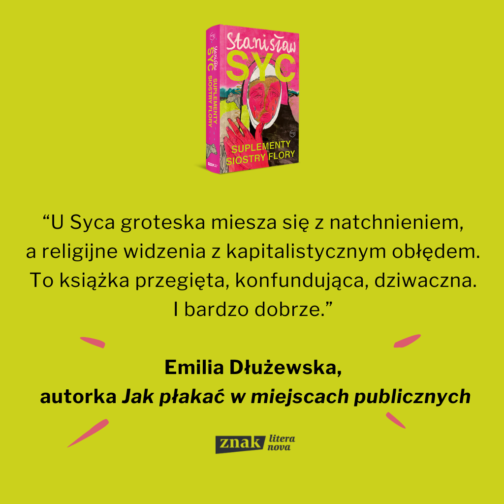 Napisany wbrew modom, queerowy psalm o zbuntowanym klasztorze Zważ, siostra Flora - podprzeorysza od przyziemności - widzenie miała. Matka Boża jej się objawiła i przesunąć nieprzesuwalne święto nakazała. Bądź się słusznie dziwiącym, albowiem mało kiedy, mało co ruszyć umie zgromadzenie karmelitanek bosych w jego posadach: to krowa Gwiazdula cieli się latem, to Przeorysza z podprzeoryszą walczyć o władzę w klasztorze są zmuszone. Czemu Matka Boża uznała wtrącić się w życie klasztorne? Ciąży co siostrom na sumieniu? Kogo kości pod jabłonką zakopane? Dowiesz się prawdy jako prawdą suplementy Flory całe? Bądź słowa nasze, duszo, zważającą, jako my są je tobie przedkładającymi. Amen Pierwszy raz w historii święte obcowanie prowadzi narrację, jakby jednym głosem przemawiali mistyczka Marchocka, Gombrowicz i Witkacy. Tę oryginalną i brawurową prozę stworzył debiutant - Stanisław Wincenty Syc - literackie objawienie, jakiego nie było od lat. STANISŁAW SYC Na wsi mieszkałem do końca szkoły podstawowej. Za pieniądze z komunii kupiłem od ciotki kozę. Nazywała się Karolina, ale z babką przechrzciliśmy ją na Bezę. U mojej drugiej babki była czerwona krowa Gwiazdula, którą kochałem nad życie. Na czole miała białą łatę w kształcie gwiazdy. W liceum w Krakowie uczyłem się na lekarza, potem na farmaceutę, aż wreszcie porzuciłem te marzenia. Aktualnie kończę studia na kulturoznawstwie i pracuję jako urzędnik. Żałuję, że nie zostałem księgowym, gdyż poniewczasie zrozumiałem, że podobałoby mi się to. Mało podróżuję, za to dużo siedzę w chałupie w Krakowie. Chciałbym mieszkać nad morzem, kocham cieki wodne i jeziora. Za górami nie przepadam. Od jakichś ośmiu lat boli mnie kark. Mam rękę do roślin i znam się na pracach gospodarskich. Boję się jeździć autem nawet jako pasażer. Nigdy nic nie publikowałem, co znaczy, że ta książka to debiut. Opinie o książce Genialne są też przejęcia, jakich Syc dokonuje z kultury LGBT, bo cały wątek klasztorno-procesyjny, wchodzenie w obraz, habity i życie w przebraniu, które jest traktowane jako zwyczajny strój, nowe imiona i rozpoczynanie życia od nowa mają bardzo mało wspólnego z Kościołem, a bardzo dużo z przesytem, ironią i ubraniami-przebraniami zakotwiczonymi właśnie w kulturze queer. Dobrze Syca przeczytać - to będzie najprzyjemniejszy grzech, jaki możecie popełnić przy użyciu książki Paulina Małochleb Brak recenzjix