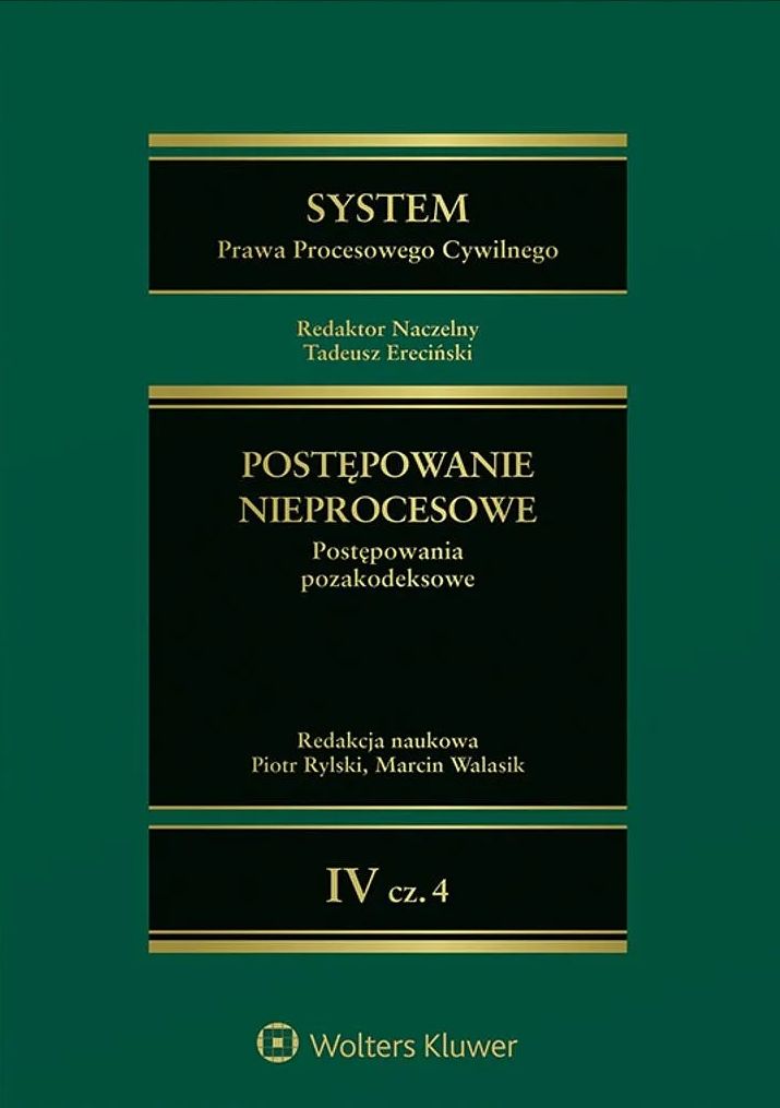 Tom IV Systemu Prawa Procesowego Cywilnego został poświęcony problematyce postępowania nieprocesowego. W 2021 r. ukazała się część 1 tego tomu pod redakcją naukową prof. Tadeusza Erecińskiego oraz prof. Kazimierza Lubińskiego prezentująca zagadnienia ogólne, które odróżniają postępowanie nieprocesowe od procesu. Zagadnienia szczegółowe obejmują postępowania ustanowione dla poszczególnych rodzajów spraw, które są rozpoznawane w trybie nieprocesowym, i są prezentowane w kolejnych częściach tomu IV. Poszczególne postępowania nieprocesowe zostały pogrupowane na podstawie kryterium przedmiotu sprawy. W części 4 podjęto tematykę podstawowych postępowań, które dotyczą spraw skierowanych na drogę postępowania nieprocesowego na mocy ustaw szczególnych. Omówiono postępowania: 1) w sprawach nieletnich, 2) w sprawach wyborczych, 3) w sprawach dotyczących dokumentów, 4) w sprawach z zakresu spółdzielczego prawa mieszkaniowego, 5) w sprawach z zakresu prawa o notariacie, 6) w sprawach z zakresu prawa morskiego 7) o orzeczenie zakazu prowadzenia działalności gospodarczej, 8) w innych sprawach: ze skargi na odmowę przyjęcia zawiadomienia o utworzeniu komitetu inicjatywy ustawodawczej, dotyczące wyborów do rady powiatowej izby rolniczej, postępowania z ustawy o własności lokali, o rozstrzygnięcie w ramach zarządu nieruchomością wspólną w razie braku zgody większości właścicieli lokali, o przyznanie państwowej kompensaty przysługującej ofiarom niektórych czynów zabronionych, wobec osób z zaburzeniami psychicznymi stwarzających zagrożenie życia, zdrowia lub wolności seksualnej innych osób. Tom IV część 4 Systemu Prawa Procesowego Cywilnego pod tytułem "Postępowanie nieprocesowe. Postępowania pozakodeksowe" pod redakcją naukową Piotra Rylskiego i Marcina Walasika jest opracowaniem zbiorowym przygotowanym przez autorów reprezentujących różne ośrodki naukowe i instytucje w Polsce. Przejrzysty układ, najwyższy poziom merytoryczny i edytorski dzieła z pewnością sprawią, że publikacja będzie stanowić nieocenioną pomoc przede wszystkim dla prawników praktyków: sędziów, referendarzy sądowych, adwokatów, radców prawnych, notariuszy, komorników sądowych. Brak recenzjix
