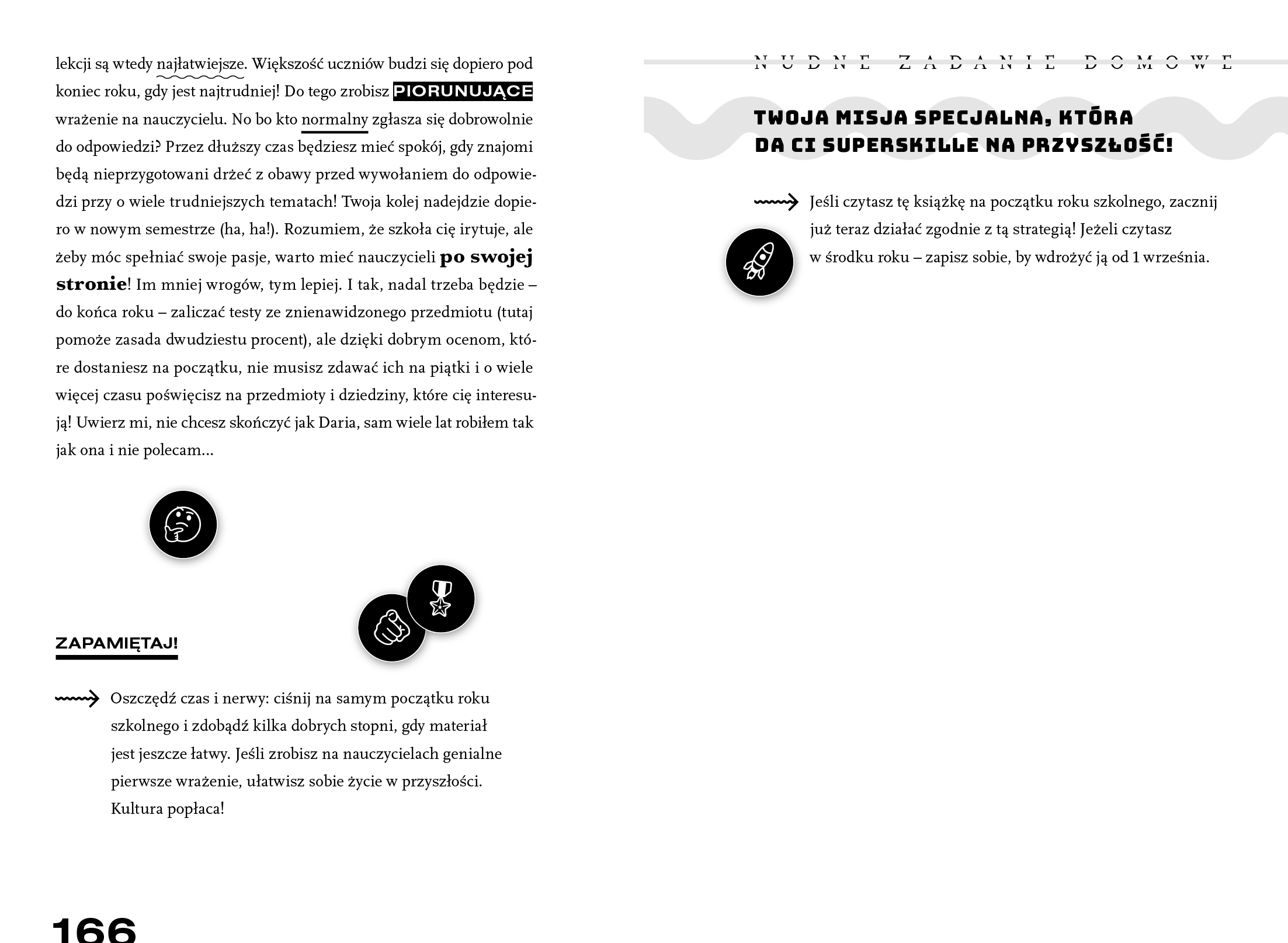 Wkuwasz budowę parzydełkowców, a wiesz, że możesz wszystko sprawdzić w internecie. Spędzasz w szkole długie godziny, a potem i tak uczysz się nocami do testów. Nie za bardzo wiesz, jak osiągnąć sukces, robiąc to, co kochasz. A szkoła nie pomaga Możesz to zmienić i sprawić, że szkoła będzie dla ciebie lepszym miejscem! Odkryj swój potencjał i rozwijaj swoje pasje! Jak się uczyć, kiedy ci się nie chce? (Bo te gry tak bardzo kuszą) Jak znaleźć czas na pasje? Jak przetrwać z chorym planem lekcji od 7.00 do 17.00? Jakich znajomych unikać w szkole jak ognia? Co zrobić, żeby nauczyciele i rodzice byli po twojej stronie? Jak wybrać, których przedmiotów uczyć się więcej, a których mniej? I jak przezwyciężyć stres i poczucie bezsilności, które łapią cię co poniedziałek? Lesław Dzik, działacz na rzecz praw uczniów, który wspiera ich w codziennych wyzwaniach. Wierzy, że można zmienić szkołę na lepszą. Prowadzi konta w social mediach, gdzie nagłaśnia przykłady szkolnych absurdów i nadużyć. Szkolne lifehacki to książka, która pomoże ci złapać dystans i znaleźć swoją drogę w życiu. Brak recenzjix