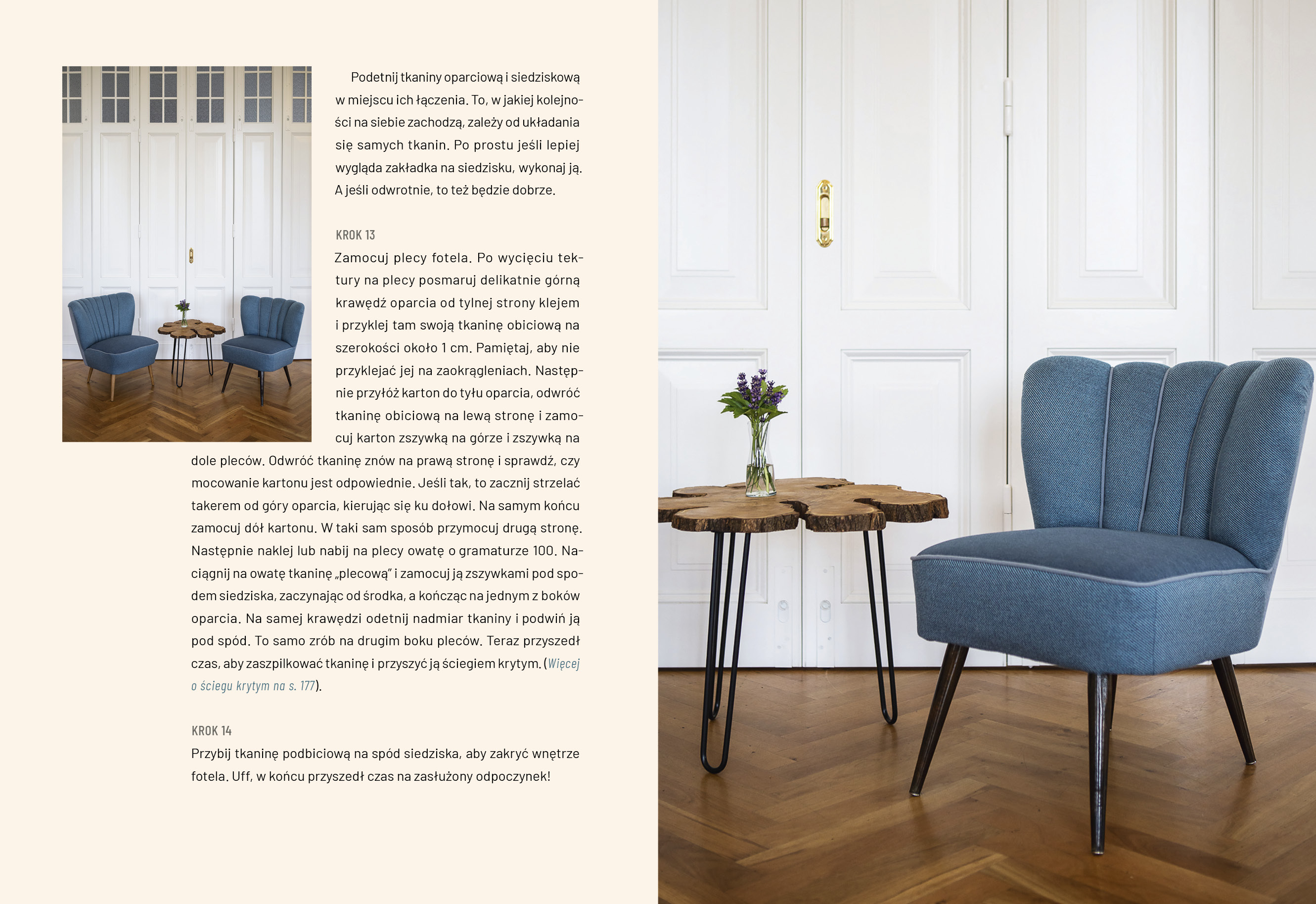 Chcesz przywrócić blask staremu fotelowi i dać mu drugą młodość, ale boisz się, że to mission impossible? Tapicerować może każdy. Wystarczą zapał, trochę cierpliwości i garść bezcennych porad prawdziwego mistrza. Alek Kądziela pokaże ci, jak własnoręcznie odnowić nawet największy rupieć, zrealizować swoje pomysły i niczego nie zepsuć. Podpowie, od czego zacząć, jak wybrać wyściółki i tkaniny, ogarnąć maszynę do szycia i zrobić piękne narożniki. Zainspiruje do wykonania własnych tapicerowanych mebli oryginalnych poduszek czy parawanu, które nadadzą charakteru twojemu wnętrzu. 21 autorskich projektów krok po kroku Tapicerowanie stylowych klasyków, m.in. chierowskiego 366, klubowego, liska, serduszka i zgrabnej AGI Tutoriale i przekazywane z pokolenia na pokolenie tapicerskie patenty, które poprowadzą cię przez tajniki rzemiosła Aleksander Kądziela od dziecka robił u ojca guziki na akord i marzył, by mieć pracownię tapicerską jak tata. Prowadzi pierwszą w Polsce szkołę tapicerstwa artystycznego i oblegane warsztaty pod hasłem #tapicerwakcji. Przez jego pracownię przewinęło się kilka tysięcy osób, które przekonały się, że tapicerowanie jest proste i daje ogromną frajdę! Mój ojciec prowadził mały zakład stolarsko-tapicerski. To właśnie u niego stawiałem pierwsze kroki, wykonywałem guziki tapicerskie na starej guzikarce, za które dostawałem pierwsze pieniądze. Pracuję na niej do dziś. Od wielu lat prowadzę pracownię mebli oraz Akademię Rzemiosła AKdesign, w której jestem szkoleniowcem. Tapicer w AKcji to moje flagowe warsztaty dla pasjonatów i fanów DIY. Każdy z uczestników przynosi ze sobą mały, stary mebel, a wychodzi z odrestaurowanym, niepowtarzalnym egzemplarzem (fragment wstępu) Alek to prawdziwy mistrz o ogromnej wiedzy, pasji i charyzmie, którymi chętnie się dzieli. Dwa dni pracy pod jego okiem to fantastycznie i efektywnie spędzony czas. Wiola Kozłowska (opinia o warsztatach) Alek to mistrz świata! Kontaktowy, wspaniały człowiek z doświadczeniem i PASJĄ, która sprawia, że można by godzinami obserwować go przy pracy i słuchać. (Dominika Rokita, opinia o warsztatach) Powyższy opis pochodzi od wydawcy. Brak recenzjix