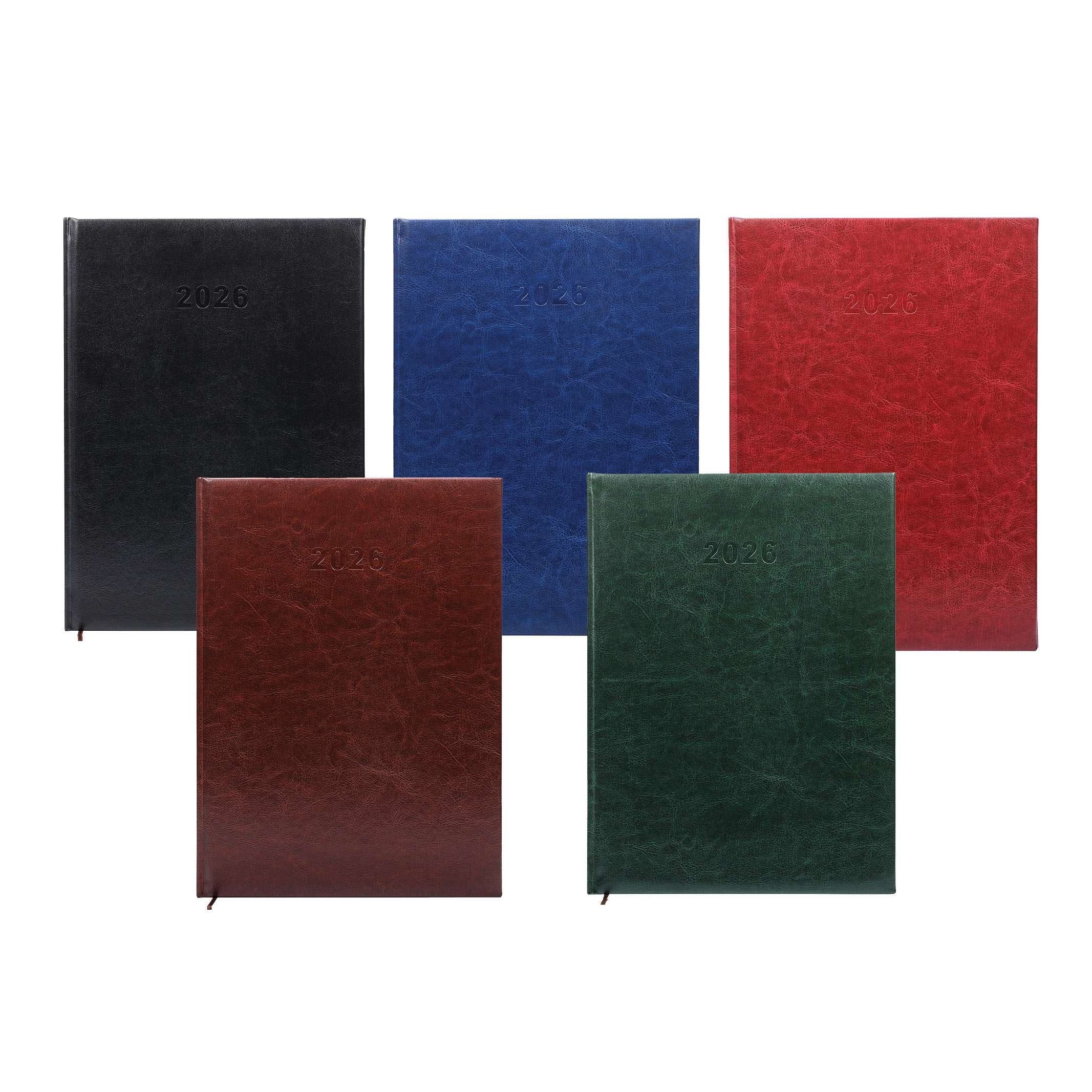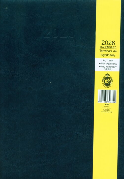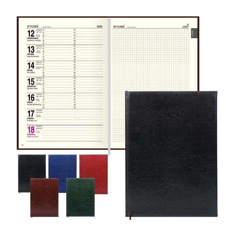 - Format A4 (204x295x22 mm) - Ilość stron: 112 - Dostępne kolory: czarny, granatowy, bordo, zielony, brąz - Oprawa: twarda skóropodobna + gąbka - Układ środka: dzień na stronie (tydzień na 1 stronie, druga strona cała na notatki) - Wewnątrz tasiemka do oznaczania stron ułatwia odnajdywanie ważnych notatek lub ostatnio zapisanej strony - Papier: 70 g/m2 w kolorze ecru - Kalendarium: w języku polskim, angielskim, numeracja dni i tygodni, podwójne imieniny - Część informacyjna: strony na notatki, telefony kierunkowe, skorowidz alfabetyczny, daty imienin i Świąt.