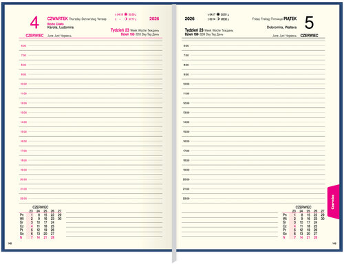 Wewnątrz kalendarza znajduje się tasiemka do oznaczania stron, co pozwala na szybkie odnajdywanie ważnych notatek lub ostatnio zapisanej strony. Kalendarium w języku polskim, angielskim i ukraińskim zawiera numerację dni i tygodni oraz podwójne imieniny. Dodatkowe strony na notatki, telefony kierunkowe, skorowidz alfabetyczny oraz daty imienin i świąt zwiększają jego funkcjonalność.Przejrzysty układ i wystarczająca przestrzeń na notatki umożliwiają swobodne planowanie każdego dnia, co czyni nasz kalendarz idealnym narzędziem dla każdego, kto ceni sobie porządek i styl.