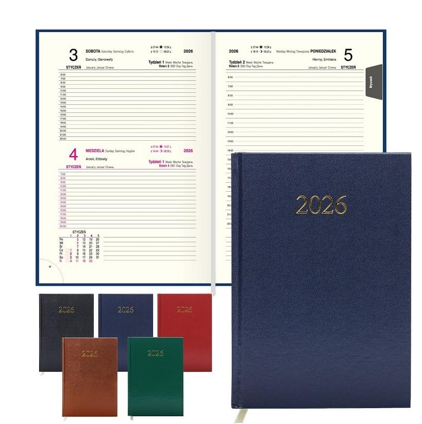 - Format A5 (140x207x22 mm) - Ilość stron: 352 - Dostępne kolory: czarny, granatowy, bordo, zielony, brąz - Oprawa: twarda PU - Układ środka: dzień na stronie ( sobota niedziela na 1 stronie) - Wewnątrz tasiemka do oznaczania stron ułatwia odnajdywanie ważnych notatek lub ostatnio zapisanej strony - Papier: 70 g/m2 w kolorze ecru - Kalendarium: w języku polskim, angielskim, numeracja dni i tygodni, podwójne imieniny - Część informacyjna: strony na notatki, telefony kierunkowe, skorowidz alfabetyczny, daty imienin i Świąt.