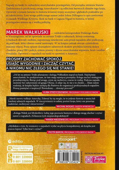 Napady na banki to najbardziej amerykańskie przestępstwo. Od początku istnienia Stanów Zjednoczonych przykuwa ono uwagę Amerykanów i jest odbiciem barwnych dziejów tego kraju. Opowieść o Jessem Jamesie to historia krwawej wojny secesyjnej i głębokich podziałów po jej zakończeniu. Losy wroga publicznego numer jeden Johna Dillingera to opis zawirowań w czasach Wielkiego Kryzysu. Skok na bank w Laguna Niguel to historia, w której przestępstwo miesza się z wielką polityką. Marek Wałkuski, wieloletni korespondent Polskiego Radia w Waszyngtonie, od lat opowiada na antenie Trójki o rabusiach, którzy zostawiają w bankach dowody osobiste, zapominają zatankować auta przed napadem albo podkopują się pod bank, który został dawno zamknięty. W tej książce oferuje jednak czytelnikom znacznie więcej. Poza opisem dziesiątków zabawnych skoków, przybliża czytelnikowi historię dolara i banków, pracę FBI i policji, system prawny i słynne więzienia, broń i wielkie wynalazki. Opowieść o napadach na banki to opowieść o Ameryce. Prosimy zachować spokój, usiąść wygodnie i zacząć czytać, a nikomu nic złego się nie stanie ;) „Od lat na antenie Trójki planujemy z kolega Wałkuskim napad na bank. Najchetniej amerykanski, bo podejrzewam, ze tam maja najwiecej pieniedzy. Kolega ma byc strategiem przedsiewziecia. Biorac pod uwage, czym sie zachwyca, czarno to widze. Podczas napadu mozemy byc zabawniejsi od gangu Olsena. A zdaje sie, ze nie o to chodzi… Mam zatem nadzieje, ze ksiazka bedzie zacheta dla Panstwa do organizacji profesjonalnych napadów. Prosze pamietac o inspiracji! Powiedzmy… dziesiec procent?” KUBA STRZYCZKOWSKI, PROGRAM 3 POLSKIEGO RADIA „Marek znowu wałkuje Ameryke. Zdawac by sie mogło, ze to jedynie historie o mniej lub bardziej udanych napadach. W rzeczywistosci to udany portret kraju, który nie przestaje zadziwiac, zachwycac i denerwowac”. MICHAŁ NOGAS, GAZETA WYBORCZA „Kolega Wałek jest błyskotliwy. Lubie jego poczucie humoru i dlatego moge słuchac i czytac nawet o napadach. Zwłaszcza tych nieprawdopodobnych”. MAREK NIEDZWIECKI, PROGRAM 3 POLSKIEGO RADIA „Myslałem o tym, by rozmowy o napadach wydac na płycie kompaktowej, ale ksiazka jest jeszcze lepsza! Tylko brac i czytac!” PIOTR BARON, PROGRAM 3 POLSKIEGO RADIA Brak recenzjix