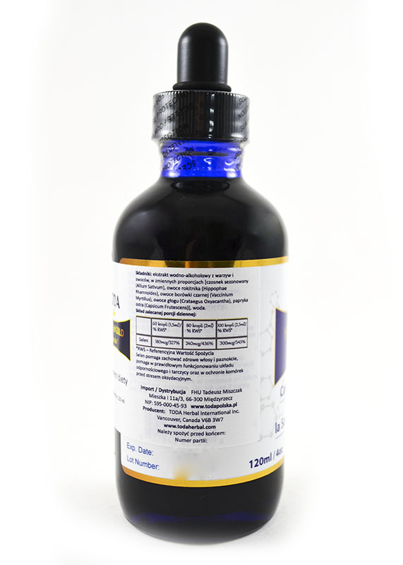 TODA Krople 120mlKrople Toda HEARTofGOLD Formula™ to najwyższej światowej klasy produkt naturalny.To starożytna receptura, którą sformułowano w fito-farmakologicznych laboratoriach w Vancouver, w Kanadzie, przy ścisłym zastosowaniu międzynarodowych standardów jakości GMP. Mikrobiolodzy przez kilkanaście lat prowadzili doświadczenia i badali szczegółowo właściwości każdej z roślin (wymienionych w składzie), by uzyskać odpowiednią formułę, która umożliwia zdrową komunikację między komórkami, ułatwiając utrzymanie równowagi w organizmie. Odpowiednie połączenie składników oraz bezpieczny sposób przyswajania (pod język) przez organizm pozwala przyjmować formułę nawet przez osoby z problemami układu pokarmowego. Sprawdzono możliwe połączenia roślin najbardziej bogatych w składniki odżywcze. Pięć z nich znalazło się w składzie formuły ziołowej HEARTofGOLD Formula™. Składniki formuły ziołowej HEARTofGOLD Formula™: Ekstrakt wodno-alkoholowy z warzyw i owoców, w zmiennych proporcjach Czosnek zwyczajny sezonowany (Allium Sativum) Owoce rokitnika ( Hippophae Rhamnoides) Owoce borówki czarnej (Vaccinium Myrtillus), Owoce głogu (Crataegus Oxyacatha) Papryka ostra ( Capsicium Frutescens), Woda Krople Toda polecane są przez Jerzego Ziębę. Sposób użycia:Wstrząsnąć przed użyciem. Stosować od 3 do 5 razy dziennie po 20 kropli trzymając pod językiem 1-2 min. Stosować najlepiej na pusty żołądek., minimum 15 minut przed każdym posiłkiem oraz rano zaraz po przebudzeniu i wieczorem przed snem. Aby uzyskać najlepsze wyniki używaj 6-12 miesięcy.