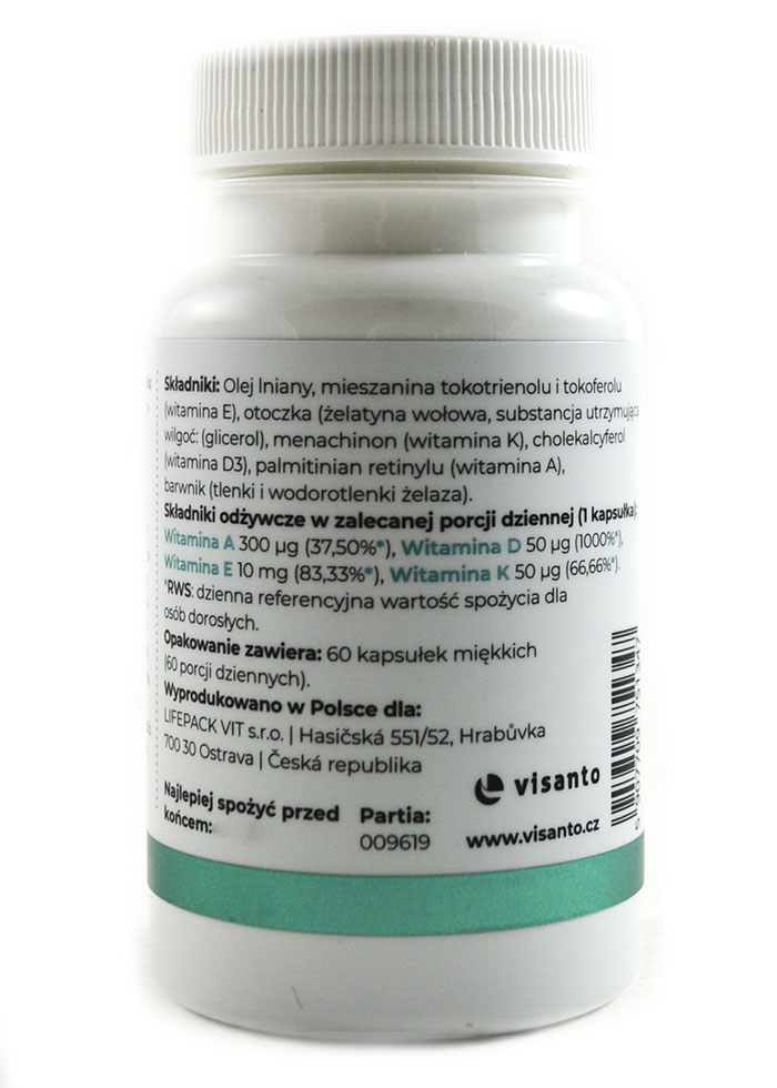 olej lniany, Sposób użycia:1 kapsułka dziennie po posiłku. Nie przekraczać zalecanej porcji do spożycia w ciągu dnia.OSTRZEŻENIE: Nie stosować w przypadku nadwrażliwości na którykolwiek ze składników. Produkt nie może być stosowany jako substytut (zamiennik) zróżnicowanej diety. W przypadku przyjmowania leków przeciwzakrzepowych należy skonsultować się z lekarzem. Przed zastosowaniem wskazane jest wykonanie badania 25-(OH)D we krwi oraz konsultacja wyniku badania z lekarzem lub farmaceutą. Przechowywanie:Przechowywać w sposób niedostępny dla małych dzieci, w suchym miejscu, w temperaturze pokojowej. Chronić przed dziećmi.Wartości odżywcze Visanto Zięba A D E K Plus 60kapsSuplement diety