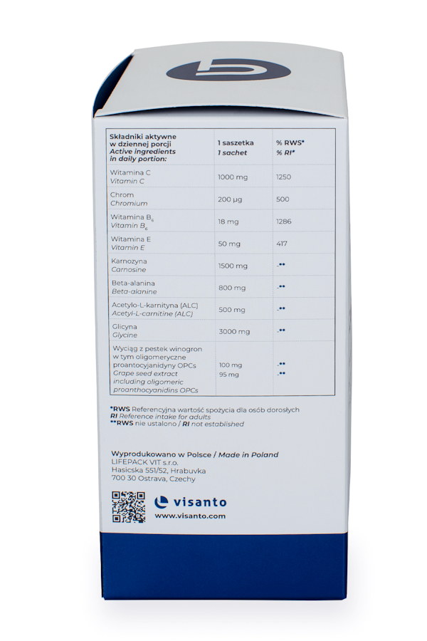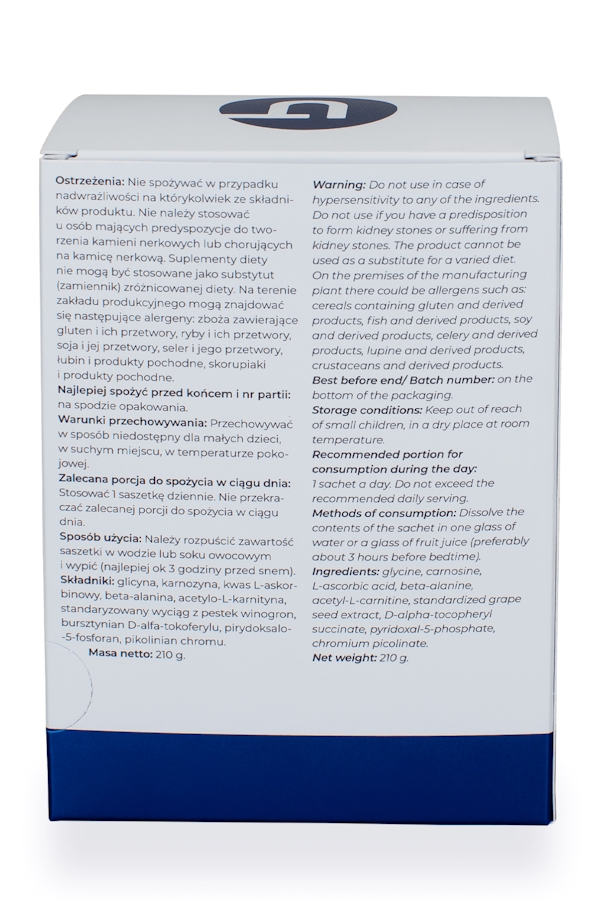Skład:glicyna, karnozyna, kwas L-askorbinowy, beta-alanina, acetylo-L-karnityna, standaryzowany wyciąg z pestek winogron, bursztynian D-alfa-tokoferylu, pirydoksalo-5-fosforan, pikolinian chromu.Przechowywanie i przeciwwskazania: