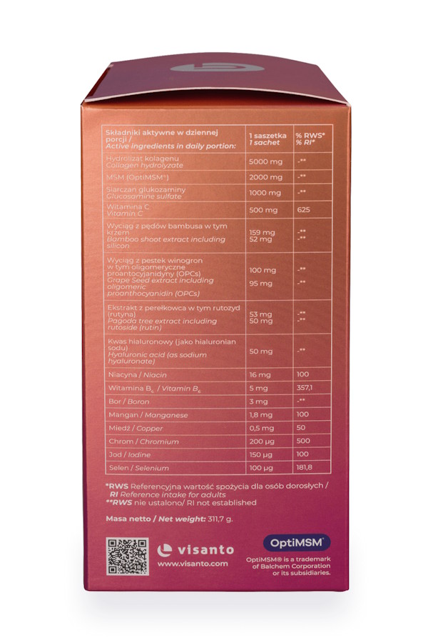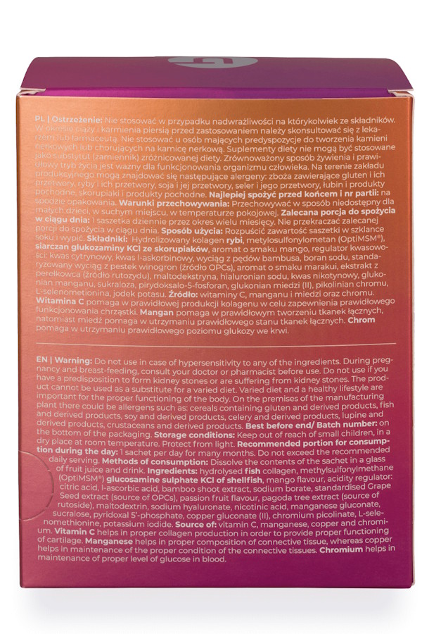Skład:Hydrolizowany kolagen rybi, metylosulfonylometan (OptiMSMⓇ), siarczan glukozaminy KCl ze skorupiaków, aromat o smaku mango, regulator kwasowości: kwas cytrynowy, kwas l-askorbinowy, wyciąg z pędów bambusa, boran sodu, standaryzowany wyciąg z pestek winogron (źródło OPCs), aromat o smaku marakui, ekstrakt z perełkowca (źródło rutozydu), maltodekstryna, hialuronian sodu, kwas nikotynowy, glukonian manganu, sukraloza, pirydoksalo-5-fosforan, glukonian miedzi (II), pikolinian chromu, L-selenometionina, jodek potasu.Przechowywanie: