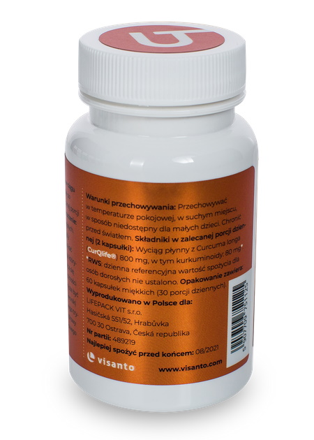 1 kapsułka 2 razy dziennie po posiłku. Przechowywanie:Przechowywać w temperaturze pokojowej , w sposób niedostępny dla małych dzieci.Wartości odżywcze Visanto Zięba Kurkumina naturalna 800mg 60kapsSuplement diety