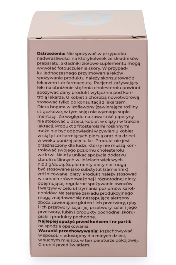 Ostrzeżenia: Nie spożywać w przypadku nadwrażliwości na którykolwiek ze składników preparatu. Składniki ziołowe suplementu mogą wywołać fotouczulenie skóry. W przypadku jednoczesnego przyjmowania leków spożywanie produktu należy skonsultować z lekarzem lub farmaceutą. Pacjenci zażywający leki na obniżenie stężenia cholesterolu powinni spożywać dany produkt wyłącznie pod kontrolą lekarza. U kobiet z chorobą nowotworową stosować tylko po konsultacji z lekarzem. Dieta bogata w izoflawony (zawierająca rośliny strączkowe, w tym soję) nie wymaga suplementacji. Ze względu na zawartość piperyny nie stosować u dzieci, kobiet w ciąży i w trakcie laktacji. Produkt z fitosterolami roślinnymi może nie być odpowiedni w żywieniu kobiet w ciąży lub karmiących piersią oraz dla dzieci w wieku poniżej pięciu lat. Produkt nie jest przeznaczony dla ludzi, którzy nie muszą kontrolować swojego poziomu cholesterolu we krwi. Należy unikać spożycia dodatku steroli roślinnych w ilościach większych niż 3 g/dobę. Suplementy diety nie mogą być stosowane jako substytut (zamiennik) zróżnicowanej diety.Produkt należy stosować w ramach zrównoważonej i różnorodnej diety, obejmującej regularne spożywanie owoców i warzyw w celu utrzymania poziomów karotenoidów. Na terenie zakładu produkcyjnego mogą znajdować się następujące alergeny: zboża zawierające gluten i ich przetwory, ryby i ich przetwory, soja i jej przetwory, seler i jego przetwory, łubin i produkty pochodne, skorupiaki i produkty pochodne.