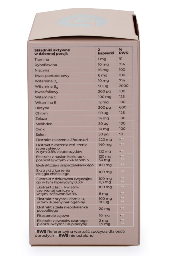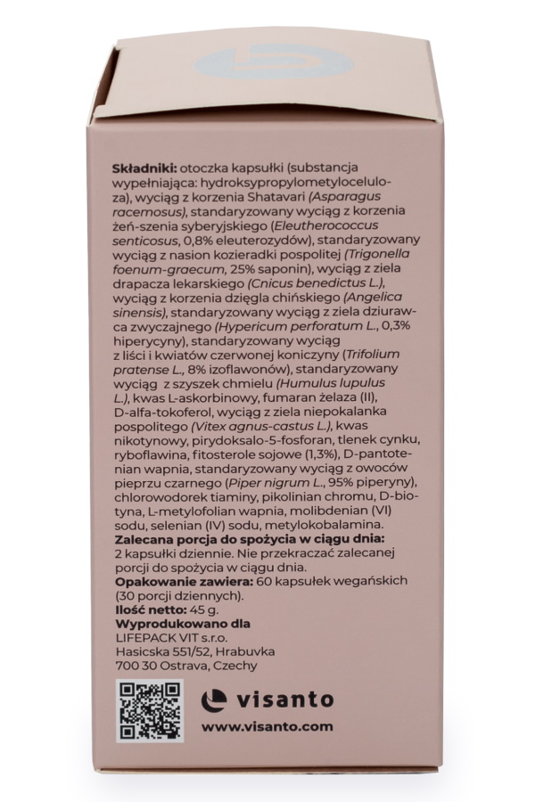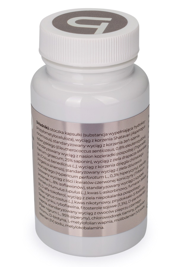 otoczka kapsułki (substancja wypełniająca: hydroksypropylometyloceluloza), wyciąg z korzenia Shatavari (Asparagus racemosus), standaryzowany wyciąg z korzenia żeń-szenia syberyjskiego (Eleutherococcus senticosus, 0,8% eleuterozydów), standaryzowany wyciąg z nasion kozieradki pospolitej (Trigonella foenum-graecum, 25% saponin), wyciąg z ziela drapacza lekarskiego (Cnicus benedictus L.), wyciąg z korzenia dzięgla chińskiego (Angelica sinensis), standaryzowany wyciąg z ziela dziurawca zwyczajnego (Hypericum perforatum L., 0,3% hiperycyny), standaryzowany wyciąg z liści i kwiatów czerwonej koniczyny (Trifolium pratense L., 8% izoflawonów), standaryzowany wyciąg z szyszek chmielu (Humulus lupulus L.), kwas L-askorbinowy, fumaran żelaza (II), D-alfa-tokoferol, wyciąg z ziela niepokalanka pospolitego (Vitex agnus-castus L.), kwas nikotynowy, pirydoksalo-5-fosforan, tlenek cynku, ryboflawina, fitosterole sojowe (1,3%), D-pantotenian wapnia, standaryzowany wyciąg z owoców pieprzu czarnego (Piper nigrum L., 95% piperyny), chlorowodorek tiaminy, pikolinian chromu, D-biotyna, L-metylofolian wapnia, molibdenian (VI) sodu, selenian (IV) sodu, metylokobalamina.